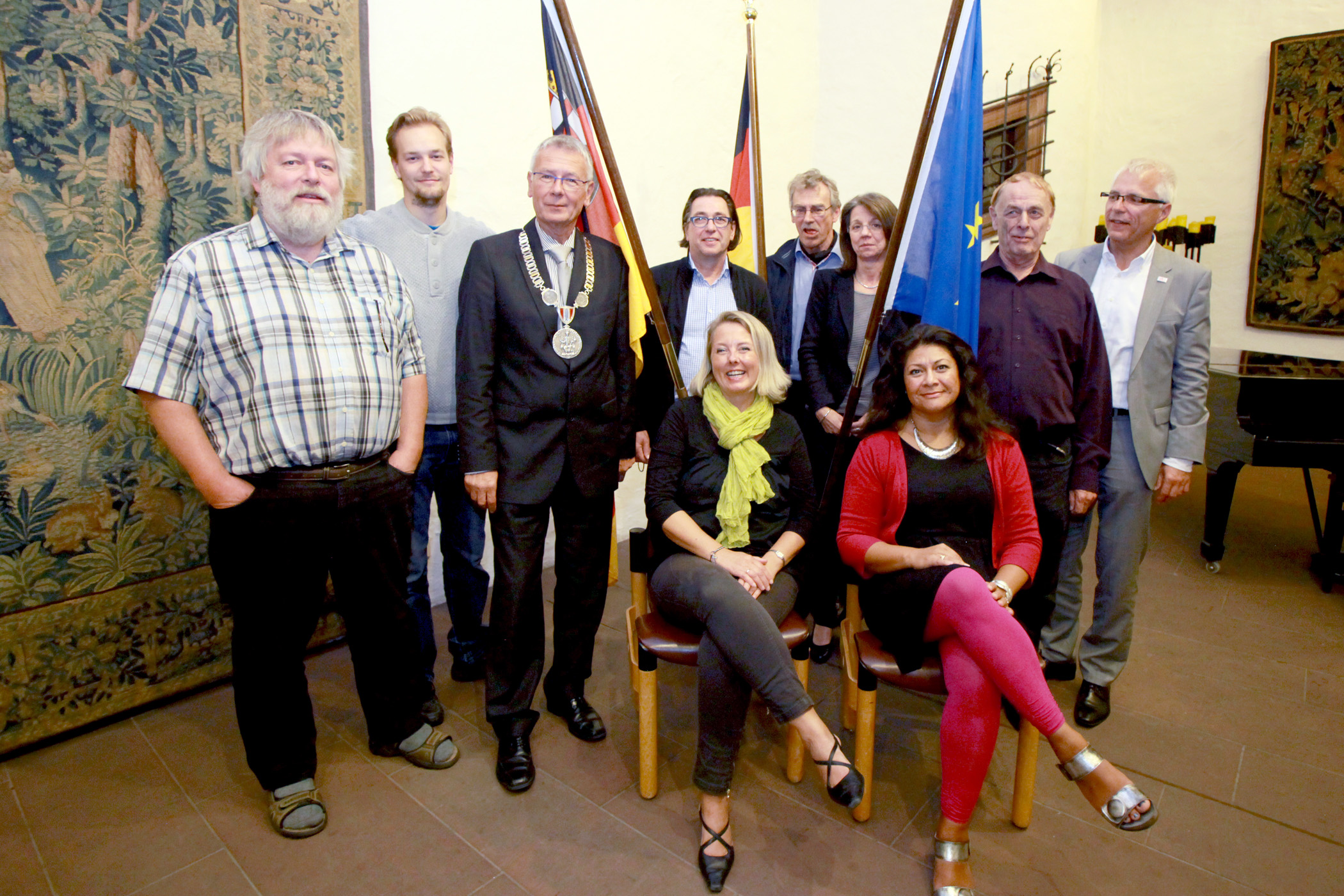 Auf Besuch in der Partnerstadt: Die Delegation aus Silkeborg mit Vertretern der Stadt Kaiserslautern im Pfalzgrafensaal des Casimirschlosses (v.l.n.r.: Leif Hoven, Alex Carving Ahn, Oberbürgermeister Dr. Klaus Weichel, Rainer Blasius, Mia Schmidt, Johny Frederiksen, Gitta Blasius, Laura del Carmen Jensen, Mogens Riget und Peter Krietemeyer). © Stadt Kaiserslautern
