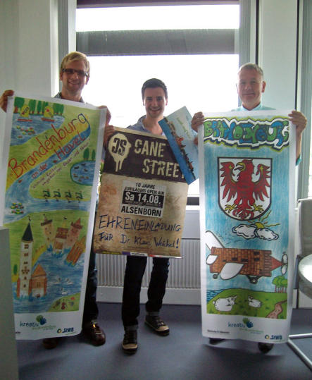 In der Region sind sie längst ein Begriff - nun machen sie auch bundesweit musikalisch auf sich aufmerksam: Die vierköpfige Lauterer Rockband "Cane Street" heizte am 18. Juni 2010 beim Havelfest der Kaiserslauterer Partnerstadt Brandenburg an der Havel den Besucherinnen und Besuchern kräftig ein. Überraschend kam im Nachgang des Auftritts die Brandenburger Oberbürgermeisterin Dr. Dietlind Tiemann auf Patrik Jung, Lars Stricker, Johannes Kronenberger und Benjamin Lambrecht zu, um ihnen als "Boten der Freundschaft" zwei Fahnen mit den besten Grüßen aus Brandenburg mitzugeben, die sie am 02. August dem Kaiserslauterer Oberbürgermeister Dr. Klaus Weichel übergaben. Dr. Weichel bedankte sich bei den Bandmitgliedern Benjamin Lambrecht und Patrik Jung. "Musik ist immer eine gute Möglichkeit, Brücken zu schlagen. Und daher freue ich mich, dass Sie mit Ihrem Auftritt Kaiserslautern in unserer Partnerstadt präsent gemacht haben." Die überbrachten Fahnen wurden anlässlich des Kreativwettbewerbs, den die Stadtwerke Brandenburg zusammen mit der Havel GmbH alljährlich ausloben, von Schülerinnen und Schülern Brandenburger Schulen gestaltet und im Stadtbild präsentiert. Nun finden die beiden Kunstwerke einen Platz im Kaiserslauterer Rathaus.