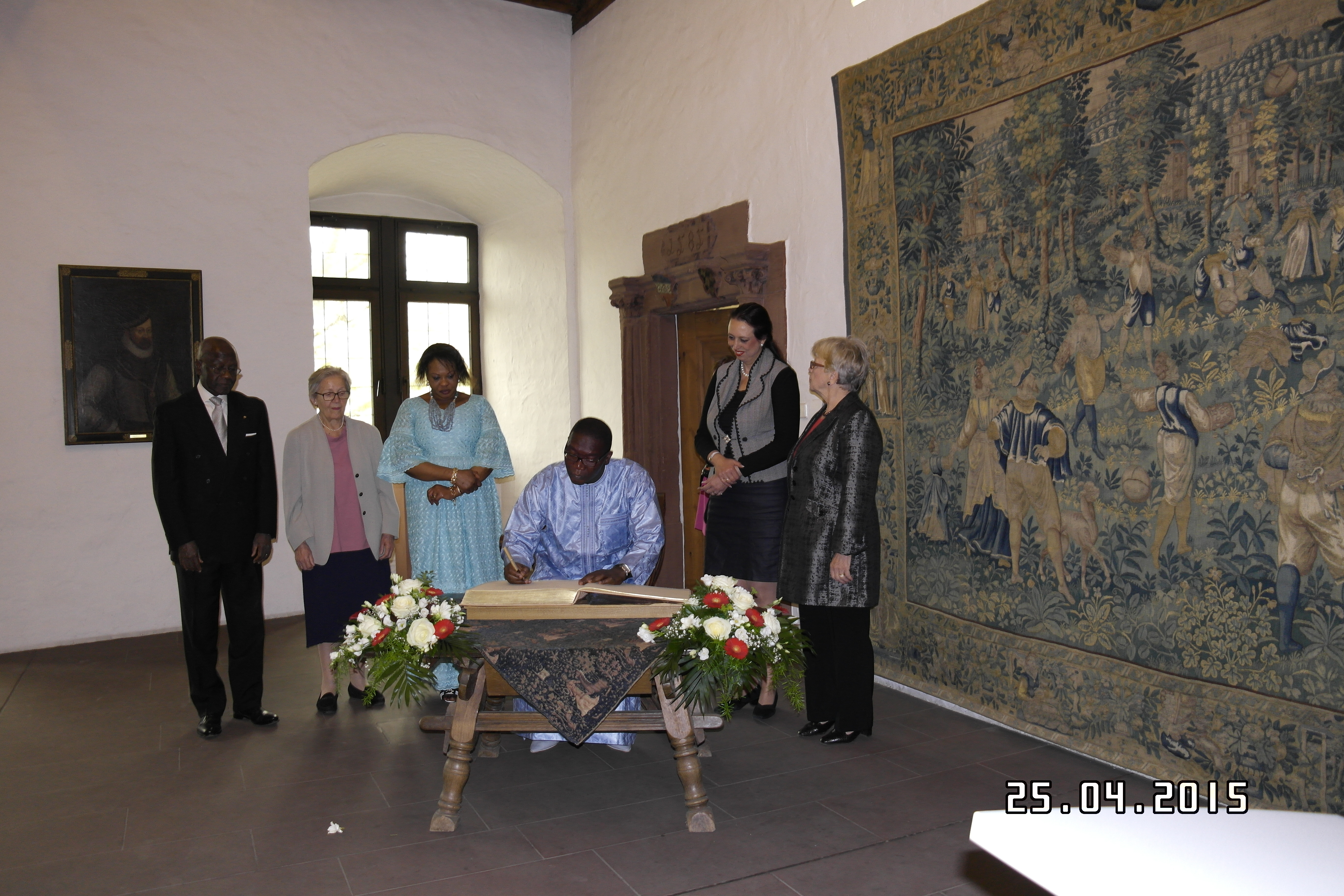 Anlässlich des 30-jährigen Jubiläums des Senegalhilfe-Vereins e.V. trugen sich vor Beginn des Festaktes im Rahmen eines kleinen Empfangs der Botschafter der Republik Senegal, Abdou Aziz Ndiaye, im Beisein seines Vorgängers General Keita, der ehemaligen deutschen Botschafterin Doretta Loschfelder sowie der Vereinsvorsitzenden Doris Racké, des Altdekans Karl-Heinrich Beck, der Bürgermeisterin Dr. Susanne Wimmer-Leonhardt und weiteren Gästen ins Goldene Buch der Stadt Kaiserslautern ein.