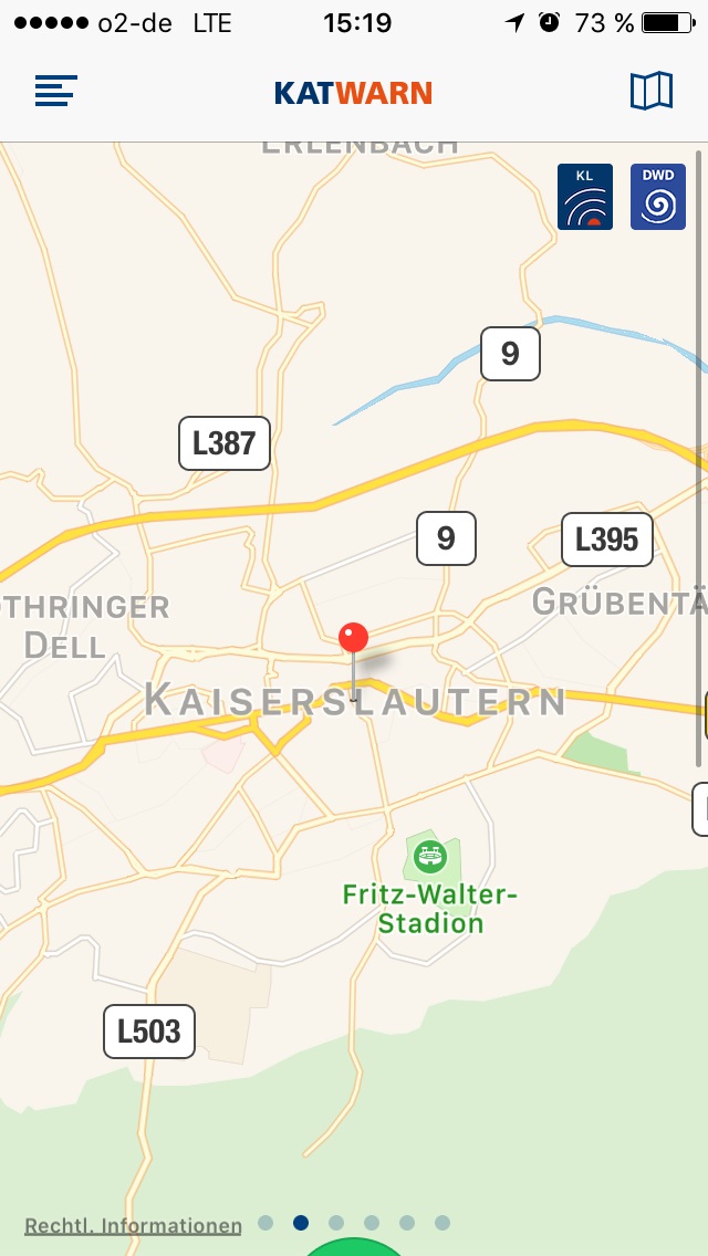 Seit Oktober letzten Jahres sendet die Stadt Kaiserslautern im Katastrophen- oder Gefahrenfall offizielle Warnungen und Verhaltensinformationen kostenfrei und direkt auf das Mobiltelefon betroffener Bürgerinnen und Bürger. Die dafür eingesetzte Smartphone-App heißt KATWARN. Das Besondere daran: KATWARN sendet Warnungen ortsgenau und nur an die Menschen, die auch wirklich betroffen sind. Dafür nutzt es die Ortungsfunktion des Smartphones oder frei zu wählende Postleitzahlengebiete. So werden bei einer Warnung im Stadtgebiet exakt die KATWARN-Nutzer informiert, die sich gerade dort aufhalten. Ebenso empfangen die Nutzer aber auch „ihre“ heimatbezogene Warnung, während sie sich beispielsweise gerade am Urlaubsort befinden.