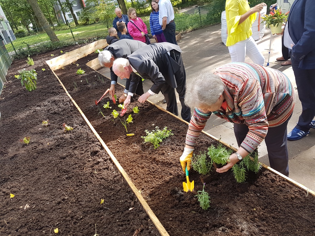 Zarte Salat-Pflänzchen und frisches Basilikum, kleine Tomaten und Baby-Gurken sowie leuchtende Glockenblumen und Chrysanthemen schmücken seit gestern einen kleinen Platz auf dem Betzenberg. Als ‚vollen Erfolg‘ bezeichneten der Beigeordnete und Aufsichtsratsvorsitzende Joachim Färber sowie der Vorstand der Bau AG, Thomas Bauer, die Bepflanzung der unterschiedlichen Beete auf einem für das Projekt barrierefrei erschlossenen Grundstück der Bau AG. Mit Unterstützung des Ökologie-Programms der Stadt Kaiserslautern waren ca. 20 Lautrer Bürgerinnnen und Bürger gefragt, selbst Hand anzulegen. Sie brachten ihre eigenen Pflanzen – verschiedene Salate, Kräuter und Blumen - und begrünten damit die Beete. Eingeladen wurden auch die Bau AG-Mieter auf dem Betzenberg, um in der Grünanlage am St-Quentin-Ring gemeinsam zu gärtnern. Der Bau AG-Vorstand Thomas Bauer begrüßt die Anwesenden und lobt die Initiative der beteiligten Bürgerinnen und Bürger vom Betzenberg. Zudem bedankt er sich für den Einsatz der Mitarbeiter aus seinem eigenen Haus, die Arbeit des Ökologie-Programms und die kostenlosen Bereitstellung der Erde durch die ZAK Kaiserslautern. Der Sozialdezernent Färber schloss sich dem Dank an und wünschte allen einen erfolgreichen Start des Stadtgärtnerns. „Das ist ein tolles Gemeinschaftsprojekt, das vom Mitmachen lebt! Ich bin auf die Entwicklung gespannt und freue mich über das Engagement der Menschen“, so der Dezernent.