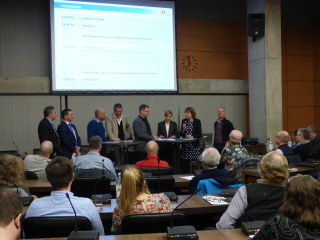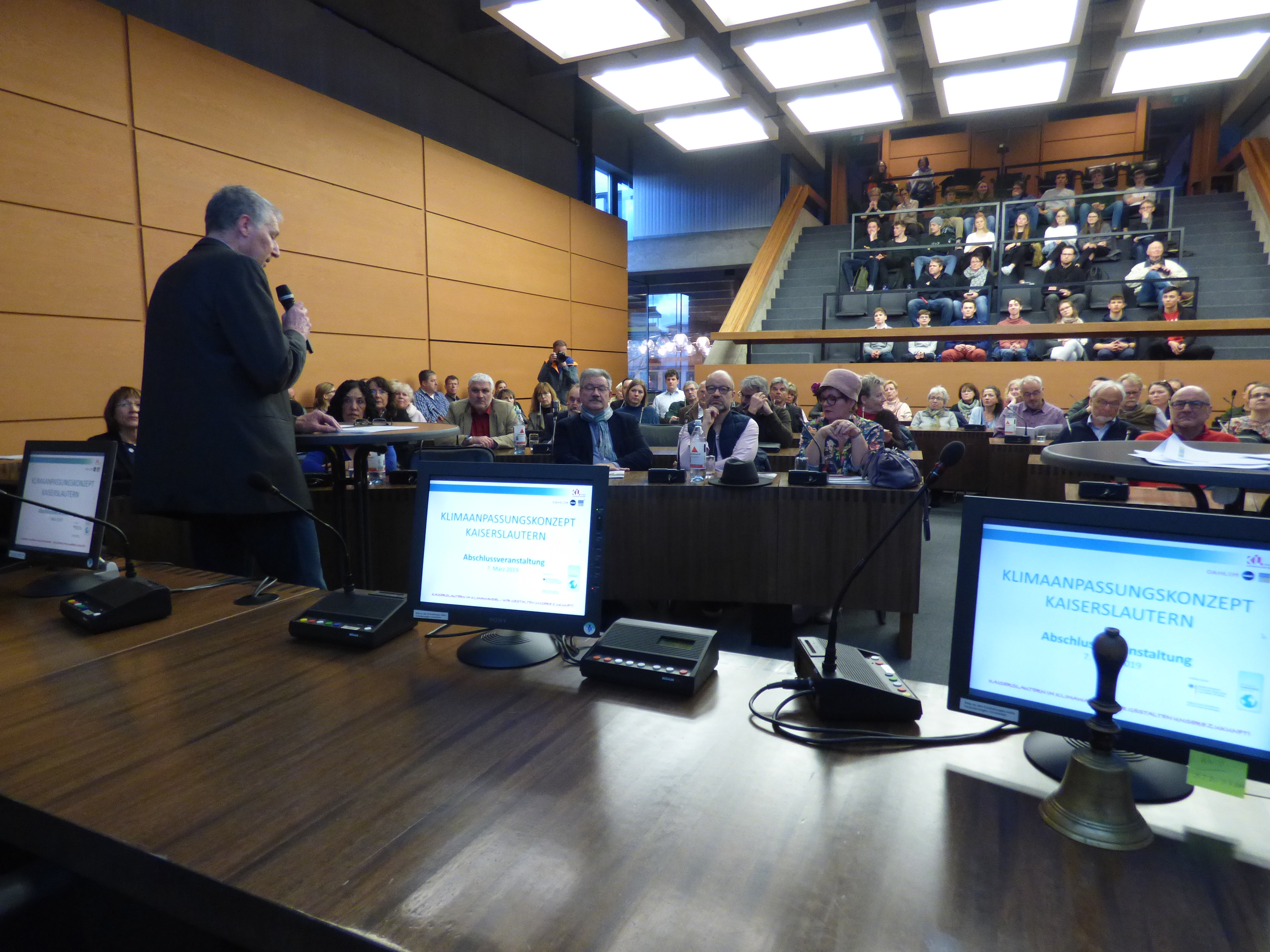 Nach gut einem Jahr intensiver Arbeit konnte am Donnerstagabend das Klimaanpassungskonzept der Stadt Kaiserslautern der breiten Öffentlichkeit präsentiert werden. Rund 100 Personen waren in den prall gefüllten Großen Ratssaal gekommen, um der Präsentation durch die drei beteiligten Ingenieurbüros Dahlem, Must und Geo-Net beizuwohnen. Nach einer Podiumsrunde mit Vertretern der Stadtverwaltung und Stadtentwässerung hatten die Bürgerinnen und Bürger Gelegenheit, Fragen zu stellen.