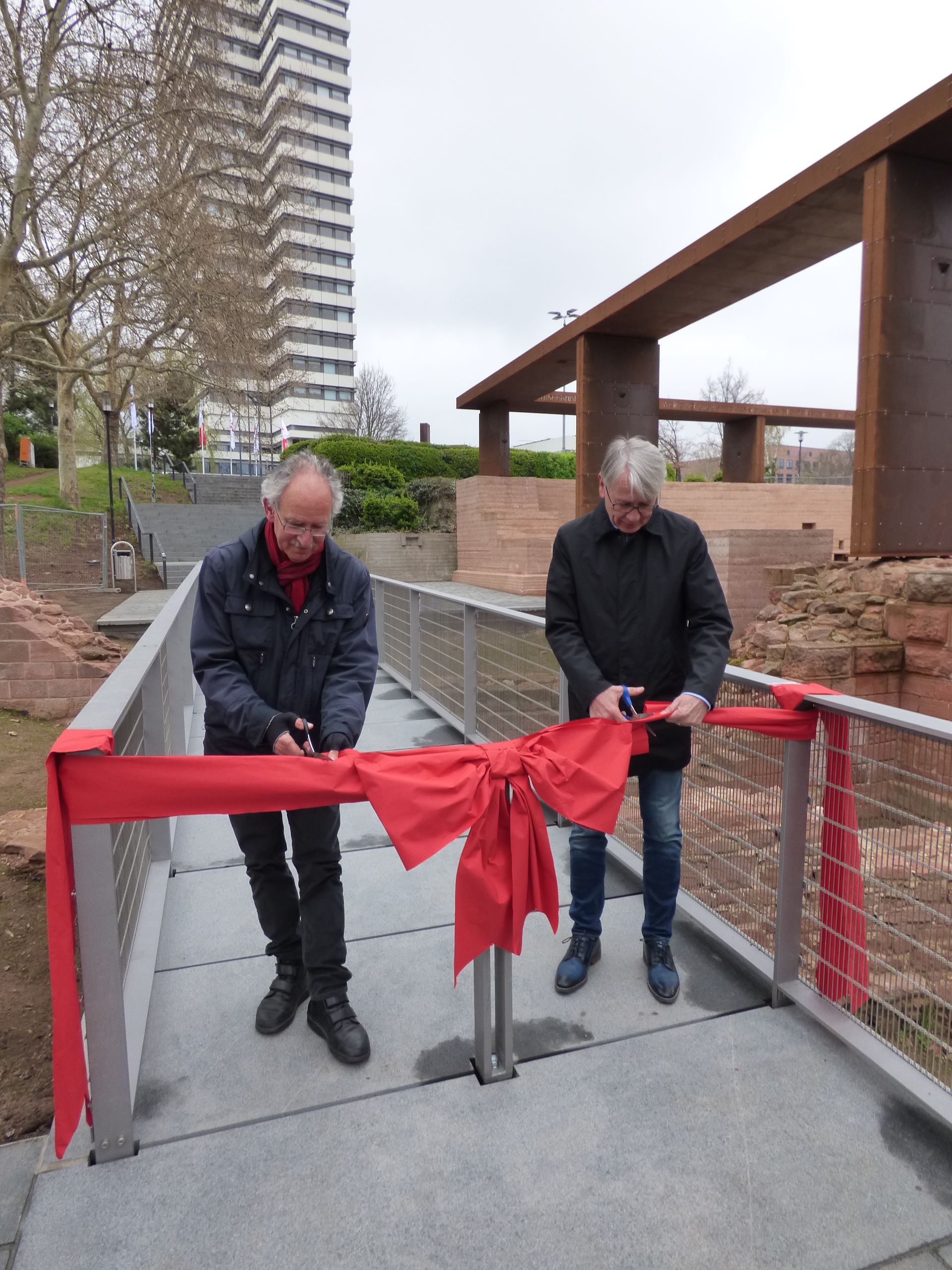 Die Erschließung des historischen Burgbergs am Fuß des Rathauses hat am Montagnachmittag einen wichtigen Meilenstein genommen. In Anwesenheit von Vertretern aus Verwaltung, Politik, des Fördervereins Kaiserpfalz sowie der beteiligten Planungsbüros und Baufirmen wurde die Fußgängerpassage zwischen Burgstraße und Rathausvorplatz offiziell freigegeben und eröffnet. Das feierliche Durchschneiden des Bandes übernahmen Oberbürgermeister Klaus Weichel als Bauherr und Rüdiger Schulz von der Generaldirektion Kulturelles Erbe des Landes Rheinland-Pfalz, die die Wiederbelebung der Anlage seit vielen Jahren begleitet.