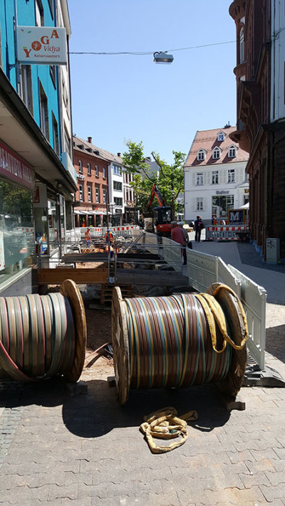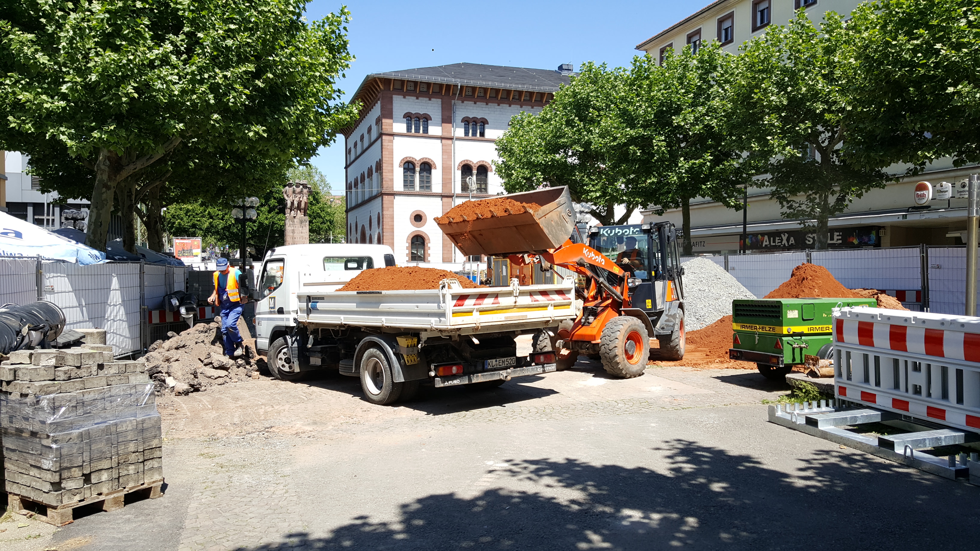 In den nächsten Wochen soll der Ausbau des ersten Teilabschnittes in der Schillerstraße fertiggestellt werden. Es geht dann nahtlos mit dem angrenzenden Teil der Schillerstraße weiter. Als letzter Bauabschnitt für dieses Jahr folgt dann der Ausbau von Am Altenhof bis zur Schillerstraße. Der abgesperrte Bereich auf dem Schillerplatz dient derzeit als Umlade- und Anlieferstation. Aufgebrochener Beton und entfernte Pflastersteine werden zwischengelagert, neues Material wird für den Einbau über die Fruchthallstraße dort angeliefert. Erst im nächsten Jahr geht es dann an den eigentlichen Schillerplatz. Im Zuge der Baumaßnahme wird der gesamte Bereich mit Leerrohren für eine Anbindung ans Glasfasernetz, dem neuesten Stand der Informationstechnologie, ausgebaut.