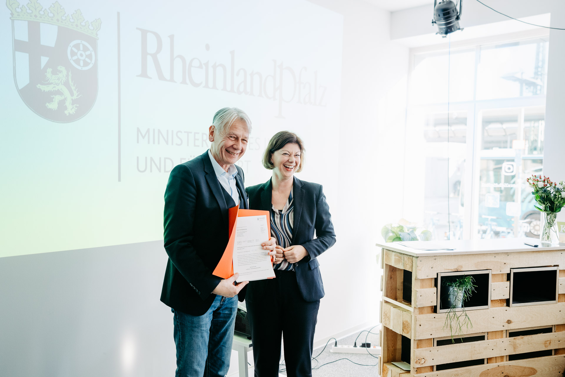 Das Ministerium des Innern und für Sport des Landes Rheinland-Pfalz hat der „herzlich digitalen Stadt“ Kaiserslautern die weitere Förderung für die Jahre 2020 und 2021 zugesagt. Damit fließen eine Million Euro an Fördermitteln in die Barbarossastadt. An der feierlichen Übergabe des Förderbescheids am 31. Oktober durch Staatssekretärin Nicole Steingaß an Oberbürgermeister Klaus Weichel in den Räumlichkeiten der KL.digital GmbH nahmen Gäste aus Wissenschaft und Forschung, Politik, Wirtschaft und Kultur teil. Ebenfalls mit dabei waren die Stadtoberhäupter des Interkommunalen Netzwerks Digitale Stadt Andernach, Speyer, Wörth am Rhein und Zweibrücken.