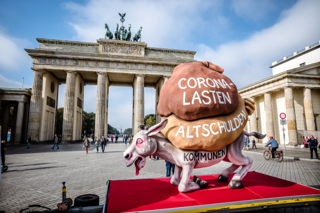 CDU/CSU, SPD, Grüne, FDP und Linke haben am Montag in Berlin Besuch von einem Esel und Vertreterinnen und Vertretern von 70 Städten und Kreisen erhalten. Der Esel war überlebensgroß auf einem Wagen zu sehen und trug gewaltige Säcke auf dem Rücken, die ihn in die Knie zwingen. Hinter der Aktion steckte das Bündnis „Für die Würde unserer Städte“, das damit auf die schwierige finanzielle Lage vieler Kommunen aufmerksam machte. Den Parteien wurde symbolisch ein beschrifteter Stein aus dem Lastensack überreicht, mit individuell gestalteten Aufschriften. So erhielt etwa die SPD den Stein mit der Aufschrift: „Das ist in Stein gemeißelt: Ein soziales Land gibt es nur mit handlungsfähigen Kommunen.“