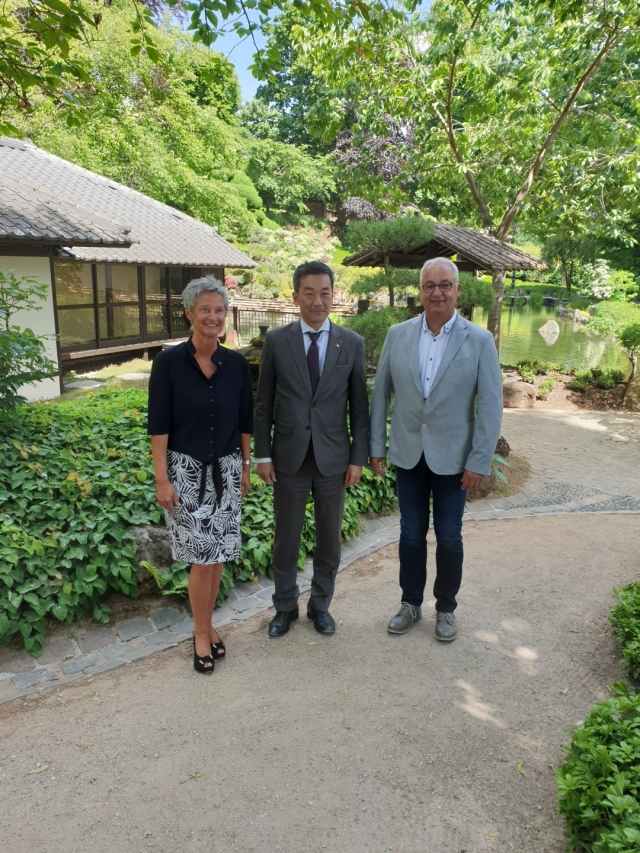 Bürgermeisterin Beate Kimmel hat am vergangenen Mittwoch den japanischen Generalkonsul Shinichi Asazuma in Kaiserslautern begrüßt. Der Generalkonsul war mit seiner Gattin unter anderem im Japanischen Garten zu Gast, wo ihm zu Ehren ein Tancho in den oberen Teich eingesetzt wurde. Ein Tancho ist ein weißer Koi mit roter Farbe im Kopfbereich. Im Japanischen Garten wurde Asazuma von Ralf Kammer, dem 1. Vorsitzenden, sowie von Beisitzer Volker Menzel begrüßt. Darüber hinaus begleiteten viele geladene Gäste die Veranstaltung, darunter unter anderem die Kreisbeigeordnete Gudrun Heß-Schmidt. Atsuko Futakuchi begeisterte mit einem Querflötenspiel auf der Terrasse des Teehauses.
