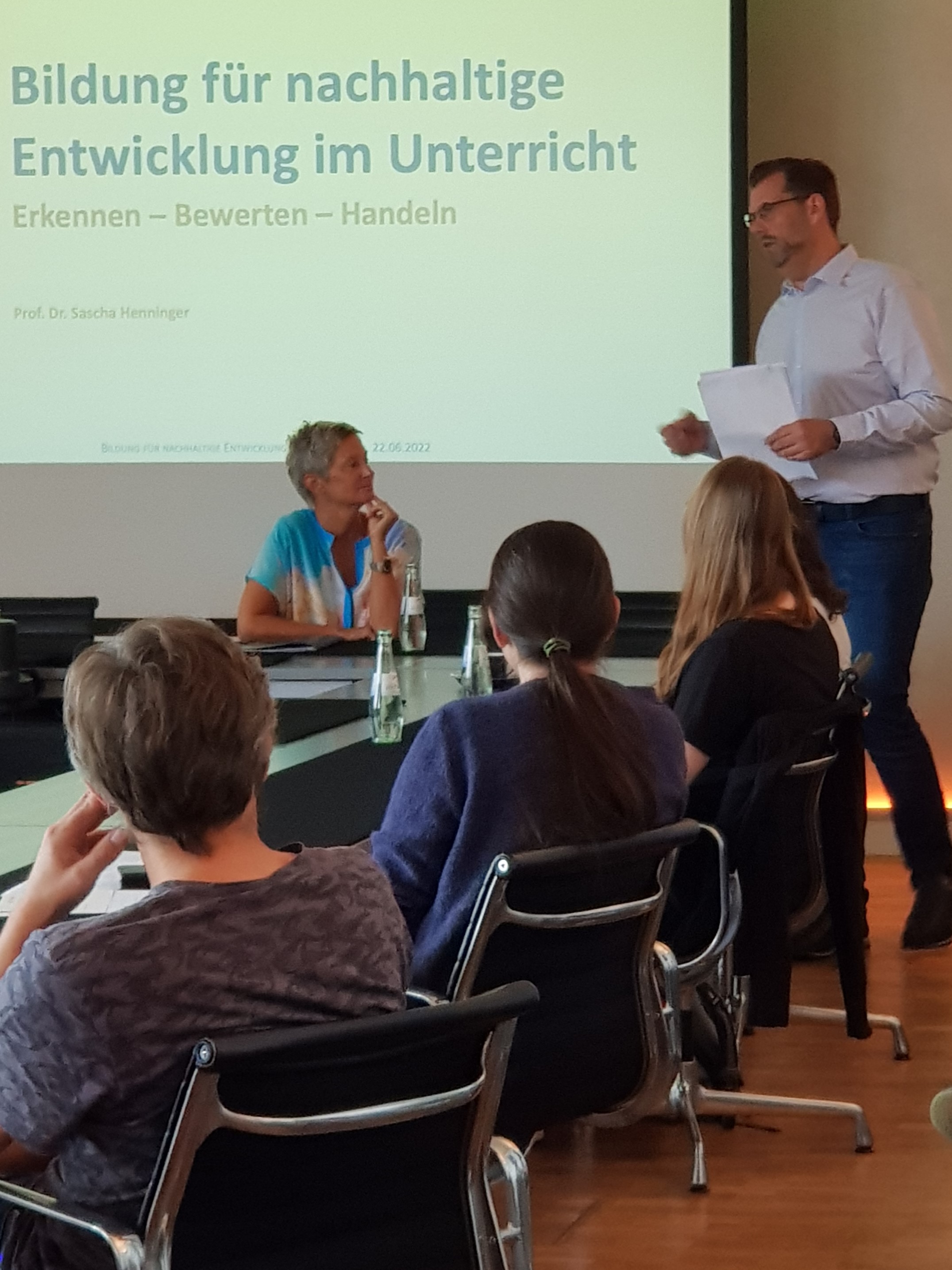 Zu Beginn der Veranstaltung gab Professor Sascha Henninger, Dekan des Fachbereichs Raum- und Umwelttechnik der TU Kaiserslautern, Einblick in die verschiedenen Ebenen von BNE. Er legte dabei anschaulich dar, wie BNE- Lerninhalte sinnvoll in die verschiedenen Fächer des schulischen Unterrichts eingebaut werden können. Dafür seien nicht nur naturwissenschaftliche Fächer geeignet, auch Musik, Sport und der Deutschunterricht eigneten sich hervorragend, Schülerinnen und Schülern die Aspekte von BNE nahezubringen.