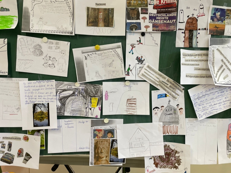 Schon am ersten Tag des Workshops stieg man voll ins Thema ein: Die Lesung von Christina Bacher aus ihrem Buch „Das Römergrab“ zog die Schülerinnen und Schüler in ihren Bann und ließ die passende Spannung aufkommen, bei der Ideen für Krimi-Storys besonders gut gedeihen. Auch die folgenden Nachmittage waren prall gefüllt: „Die Kinder sind unglaublich kreativ“ zeigt sich Bacher begeistert von der Dynamik des Kurses, „sie sprudeln geradezu vor Ideen. Wir haben Geschichten, Gedichte, Songtexte und zwei Theaterstücke entworfen – und das in kürzester Zeit!“ Zum Abschluss präsentieren die angehenden Krimiautoren die entstandenen Werke ihrem Publikum: den Lehrerinnen und den anderen Schülerinnen und Schülern, und zwar als Lesung auf der großen Bühne in der Schulaula am 10. November.