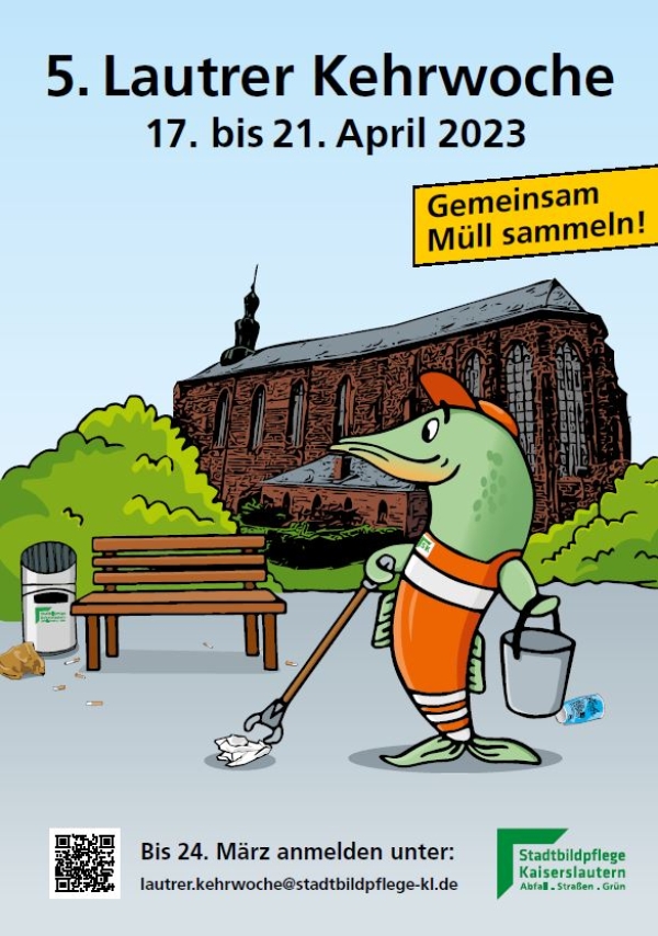 Die stadtweite Müllsammelaktion „Lautrer Kehrwoche“ findet in diesem Jahr vom 17. bis 21. April 2023 statt. Wie gewohnt übernimmt die Stadtbildpflege Kaiserslautern die Organisation und Koordination der Reinigungswoche. Umweltbewusste Kindergärten, Schulen, Vereine, Familien und Unternehmen können sich bis zum 24. März unter der E-Mail-Adresse lautrer.kehrwoche@stadtbildpflege-kl.de anmelden.