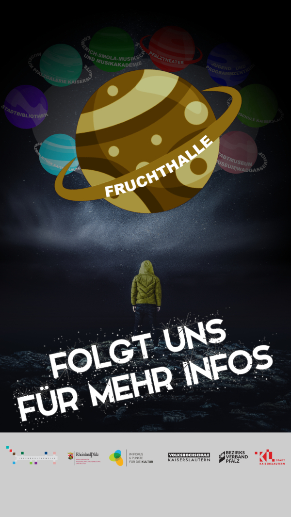 Bald ist es soweit - die zweite KultN8 der Jugendkulturmeile Kaiserslautern geht an den Start! Am 14. April 2023 werden die Kultureinrichtungen der Westpfalzmetropole wieder von 18:00 bis 23:00 Uhr ihre Pforten öffnen und für Jugendliche und junge Erwachsene ein abwechslungsreiches und spannendes Programm anbieten. Mit dabei ist auch die Fruchthalle, die für ihren Beitrag noch junge bildende Künstlerinnen und Künstler sucht, die Lust haben, ihre Werke einem breiten Publikum zu präsentieren. Interessierte können sich bis zum 24. März 2023 unter kerstin.brechtel@kaiserslautern.de mit einem Foto ihres Kunstwerks oder dessen Beschreibung unter Angabe ihres Namens und ihrer Schule bewerben.