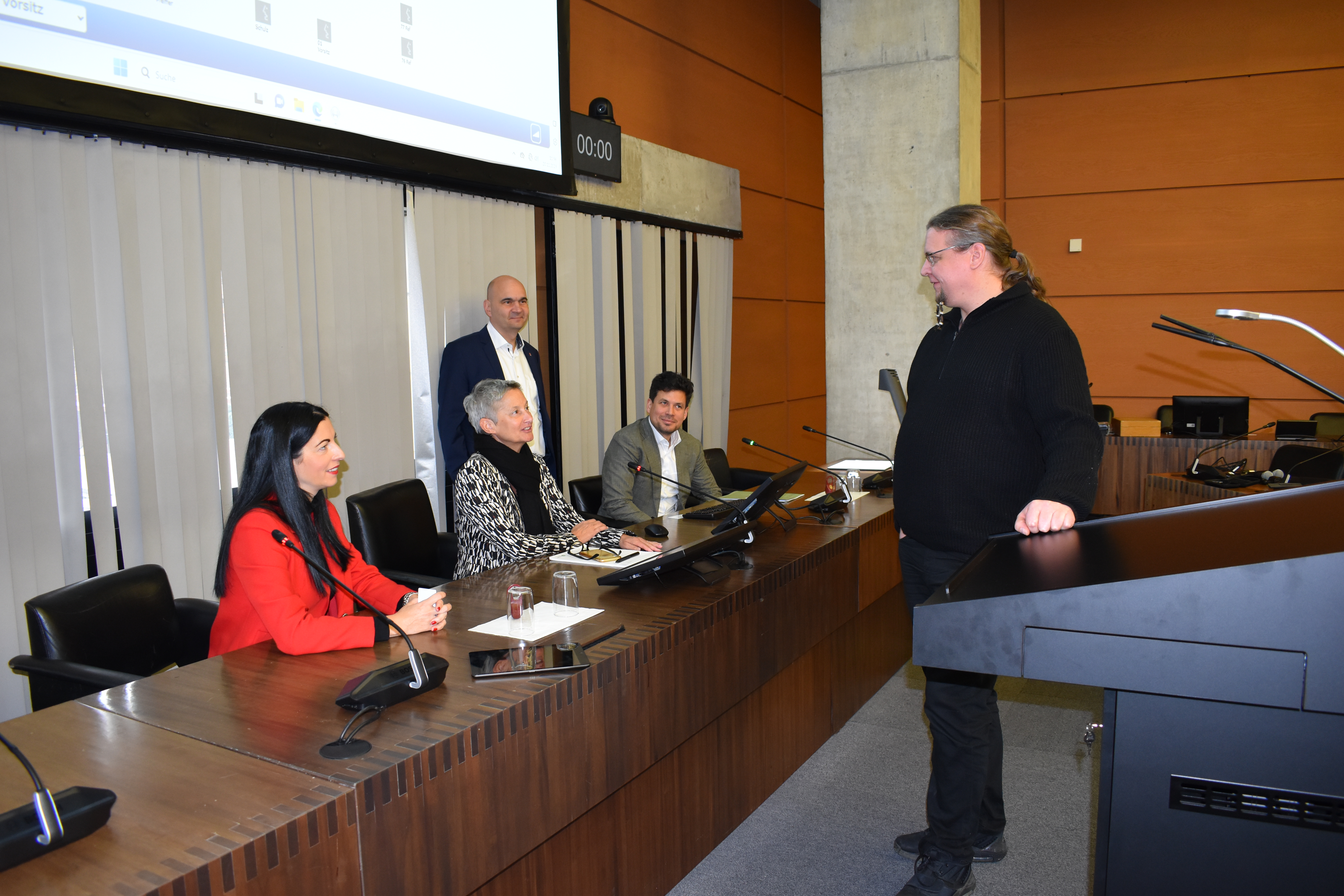 Kurz bevor die neue Ratssaaltechnik bei der Sitzung des Stadtrats am Montagnachmittag ihre Premiere feierte, wurden die Mitglieder des Stadtvorstands im Umgang mit der neuen Hard- und Software geschult. Das Foto zeigt Oberbürgermeisterin Beate Kimmel (2.v.l.), Bürgermeister Manfred Schulz (3.v.l.)und die Beigeordneten Anja Pfeiffer und Manuel Steinbrenner bei den Erklärungen von Ole Boenigk, Projektleiter bei der Furacom GmbH.