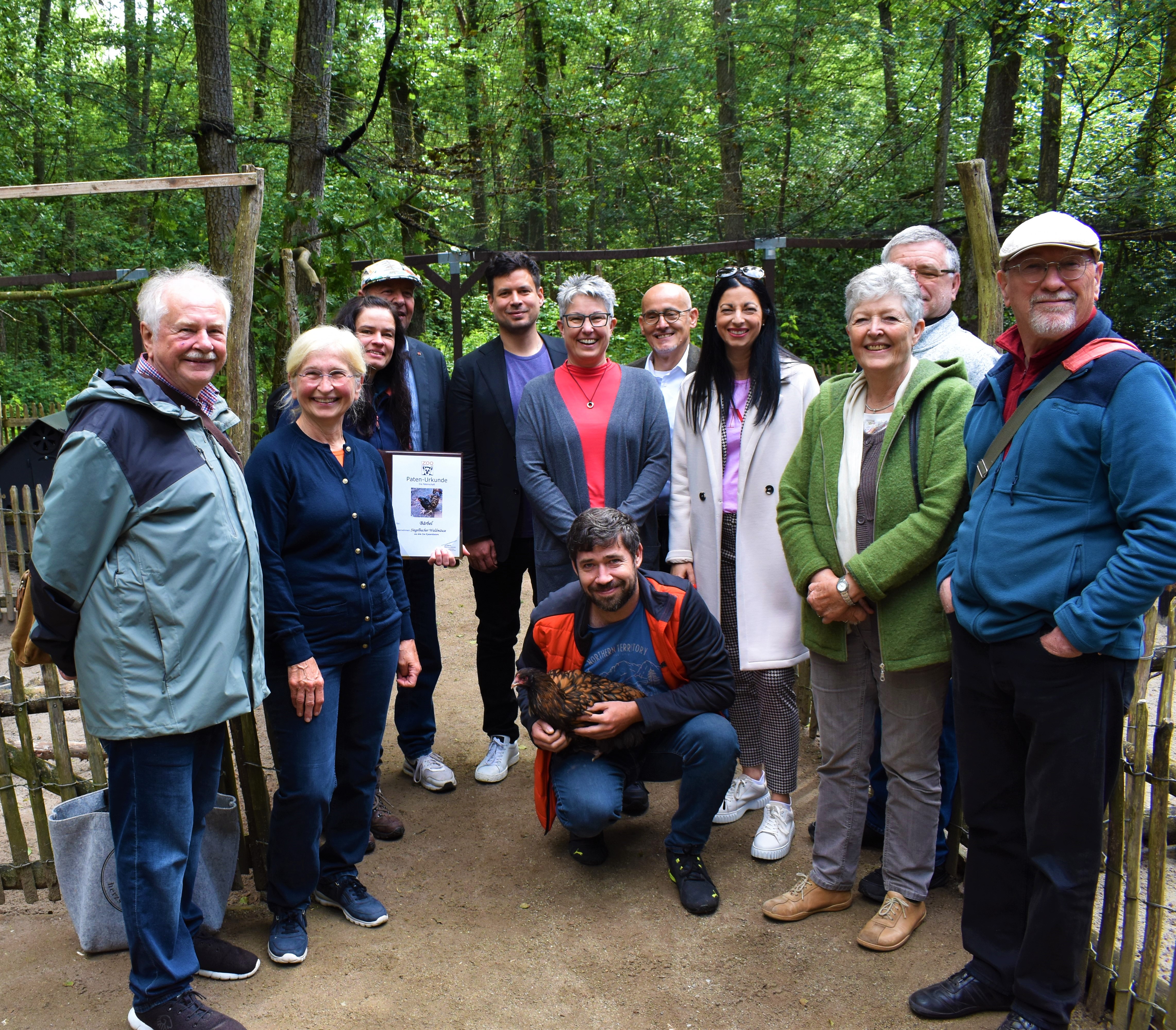 Streicheleinheiten für Patenhuhn Bärbel, das Zoo-Pädagoge Danny Stock (1.v.r.) im Beisein von Jugenddezernentin Anja Pfeiffer (2.v.r.) und Zoo-Dezernent Manuel Steinbrenner (1.v.l.) seinen künftigen Schützlingen, den Siegelbacher Waldmäusen, vorstellt. © Stadt Kaiserslautern