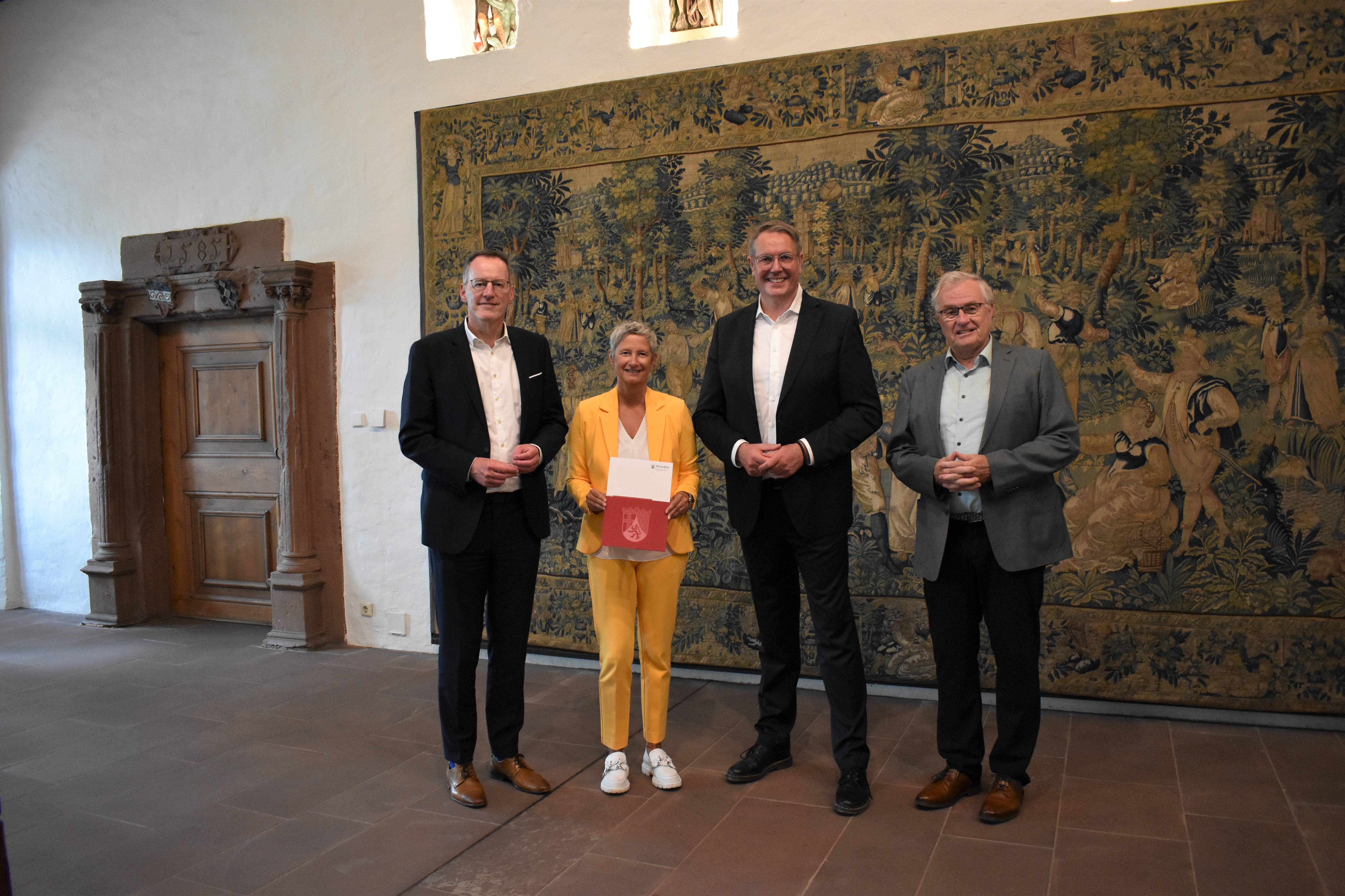Innenminister Michael Ebling, Oberbürgermeisterin Beate Kimmel, Ministerpräsident Alexander Schweitzer und Bezirkstagsvorsitzender Theo Wieder bei der Übergabe des Förderbescheids für das Pfalztheater im Pfalzgrafensaal. © Stadt Kaiserslautern