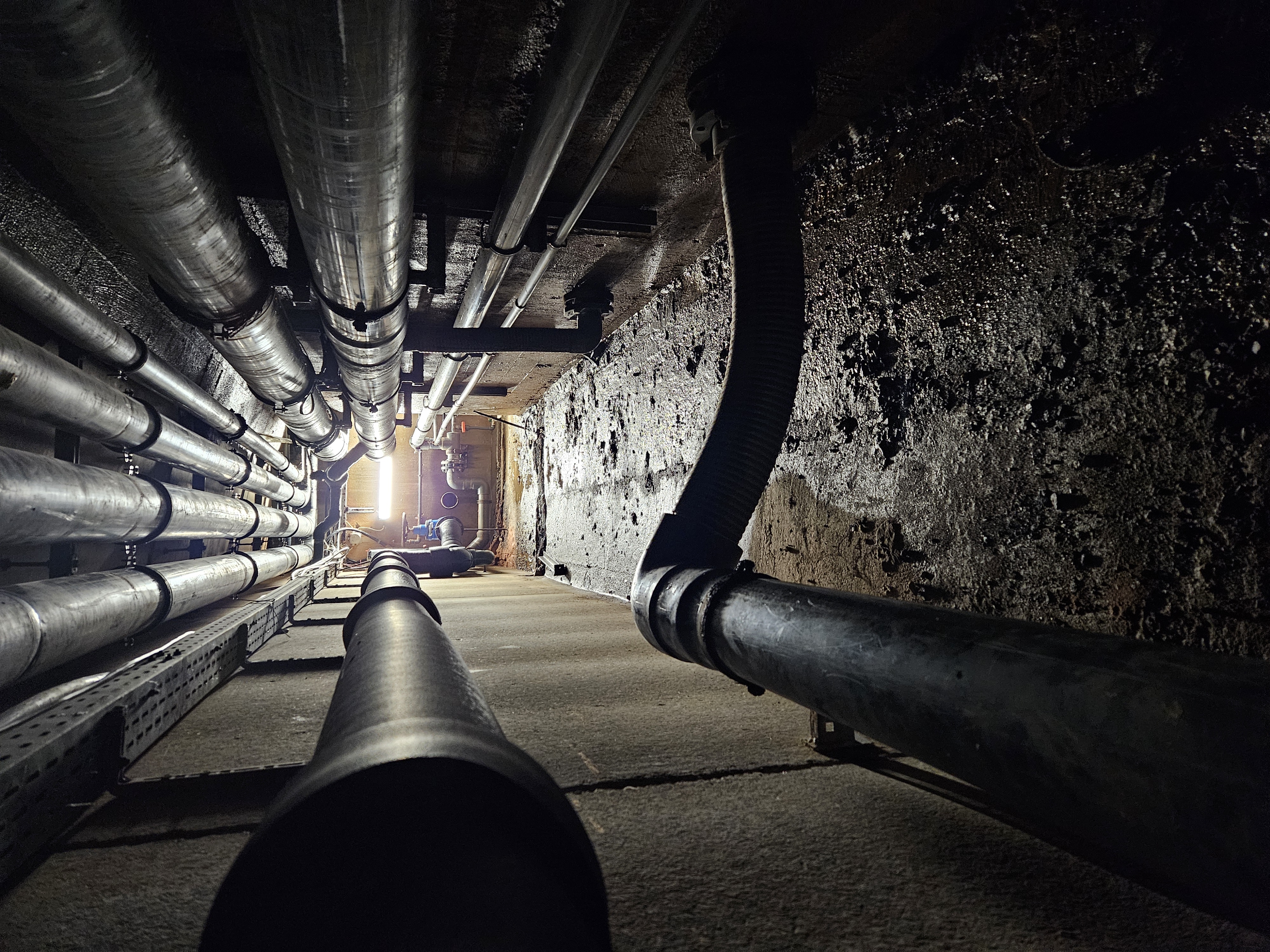 Das Schwimmerbecken ist mit einem Gang, durch den sämtliche Rohre laufen, mit den Technikräumen verbunden. Dieser Gang umläuft das Becken komplett. Wer sich also nicht vor engen Räumen und niedrigen Decken scheut, kann das Schwimmerbecken auf diesem Weg vollständig umrunden. Die dicken Rohre führen das Rohwasser des Schwimmerbeckens zur Aufbereitung und das Reinwasser zurück. Die anderen Rohre beherbergen sämtliche anderen Leitungen und führen u.a. auch ins Haupthaus des Bades mit Trinkwasser, Heizung, Strom, Internet etc.. © Stadt Kaiserslautern