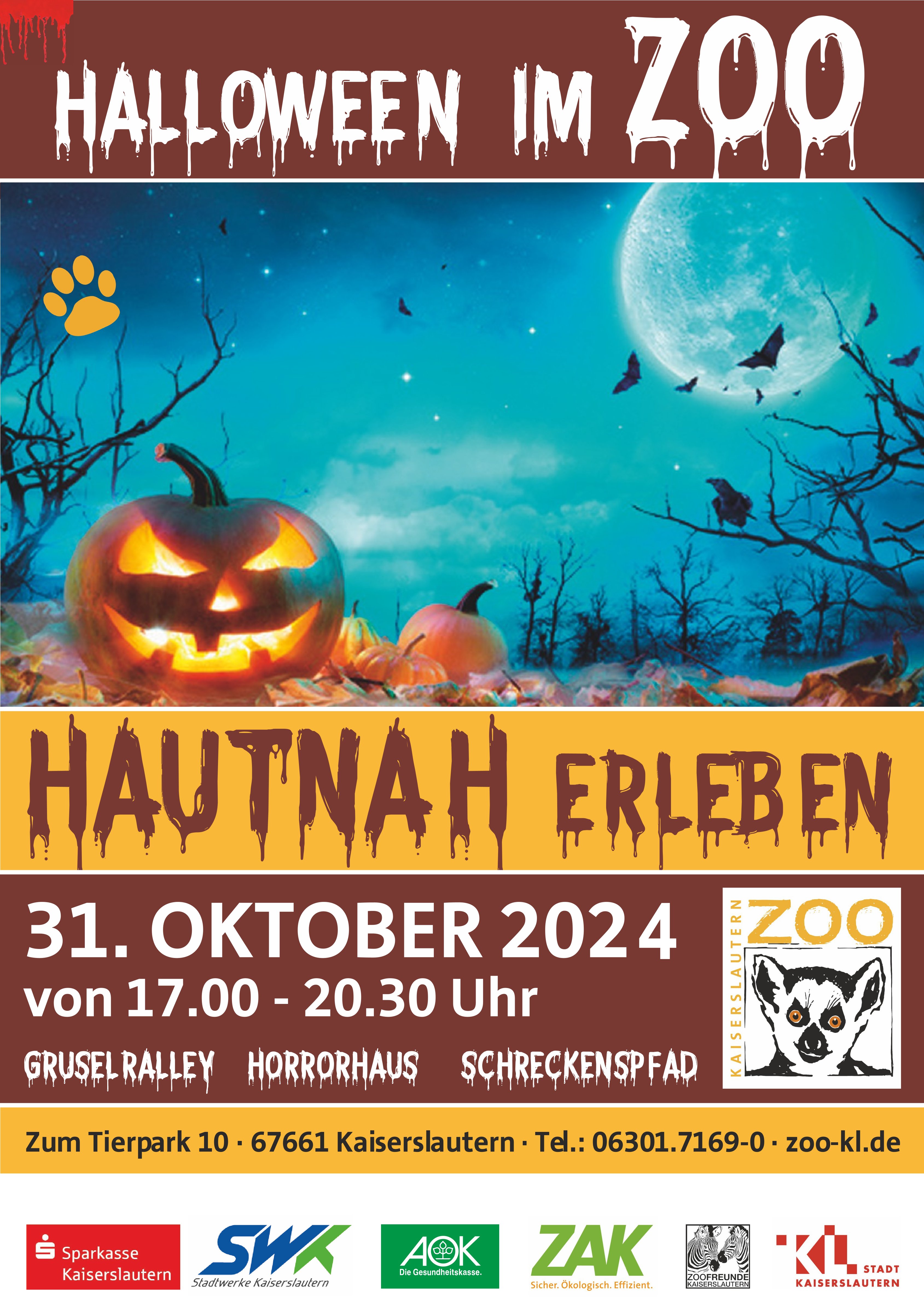 An Halloween (31. Oktober) wird der Zoo-Kaiserslautern von 17.00 Uhr bis 20.30 Uhr von Geistern, Hexen und Monstern heimgesucht. Auf die mutigen Besucherinnen und Besucher warten ein gruseliger Parcours durch den Zoo und die "Horror-Rallye".