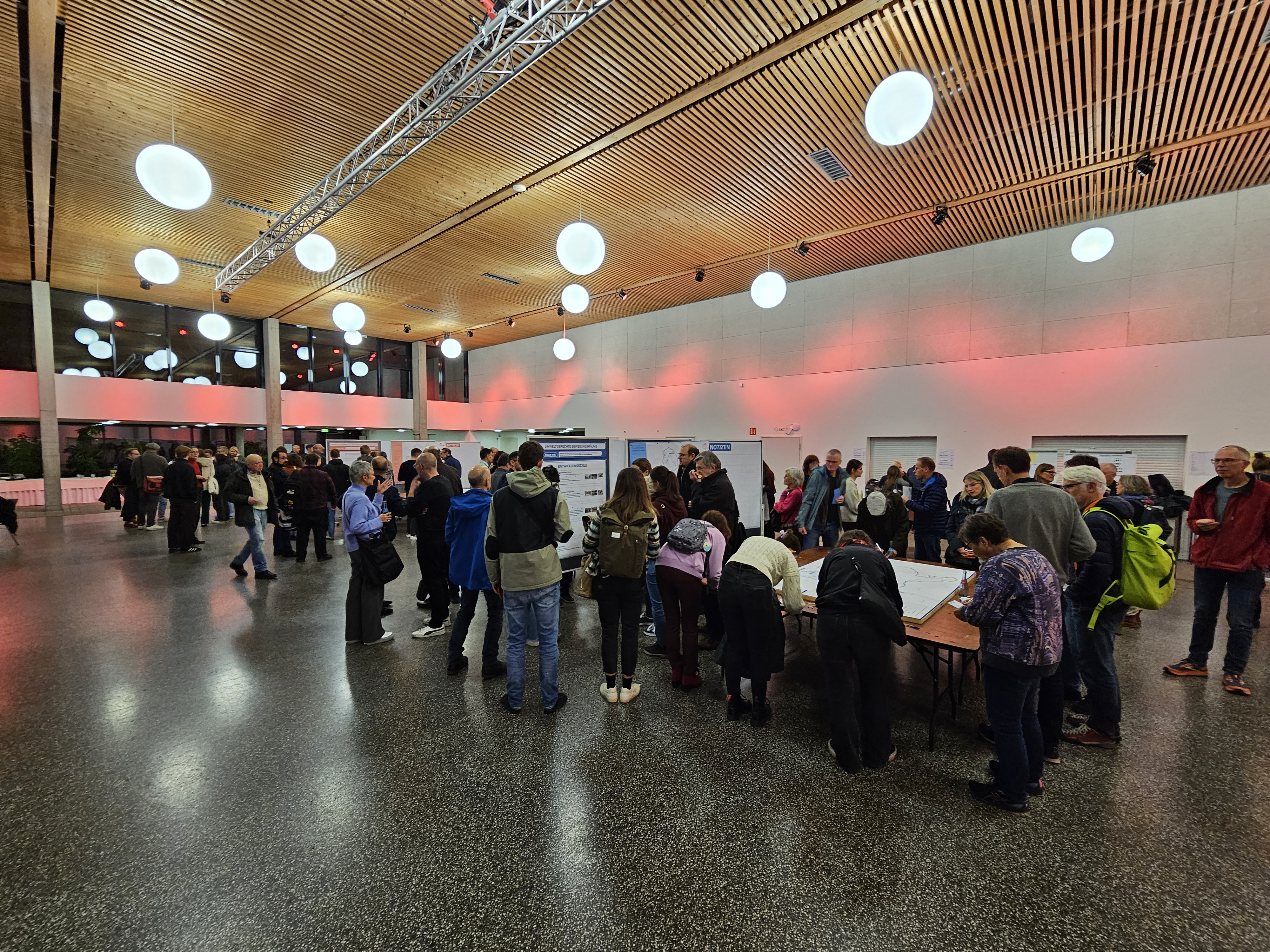 Im Anschluss stellte die Bürogemeinschaft in einer Präsentation die bisherigen Arbeitsschritte und Ergebnisse kurz dar. Danach ging es für die anwesenden Bürgerinnen und Bürger an vier Mit-mach-Tische. Hier konnte man sich an Plänen informieren, die vorgeschlagenen Strategien für die vier Handlungsfelder prüfen und priorisieren, eigene Anregungen und Maßnahmen auf Kärtchen schreiben und diese auf einem Lageplan verorten. Im Anschluss an den Arbeits- und Diskussionsprozess wurden an jedem „Mit-mach-Tisch“ die Ergebnisse kurz zusammengefasst.