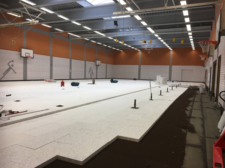 Zu Beginn der Arbeiten mussten der alte Sportboden entfernt und die Bodenkanäle freigelegt werden. Zur Untersuchung wurden mehrere Kernbohrungen durchgeführt und der Bestand genau erfasst. Mittlerweile sind die alten Kanäle in der Turnhalle mit Beton verfüllt und die Firma, die den Hallenboden verlegt, hat mit den Arbeiten begonnen. Der Bitumenvoranstrich ist aufgetragen und Bitumenschweißbahnen sind verlegt. Auch die Ausgleichsschüttung sowie die Dämmung sind bereits fast bis zur Hälfte der Halle eingebracht und verlegt. Anschließend werden die Hartschaum-Profilelemente mit eingelegten Wärmeleitblechen und die Fußbodenheizung eingebaut, woraufhin eine Trenn- und Gleitfolie sowie darauf der flächenelastische Sportboden verlegt werden können.