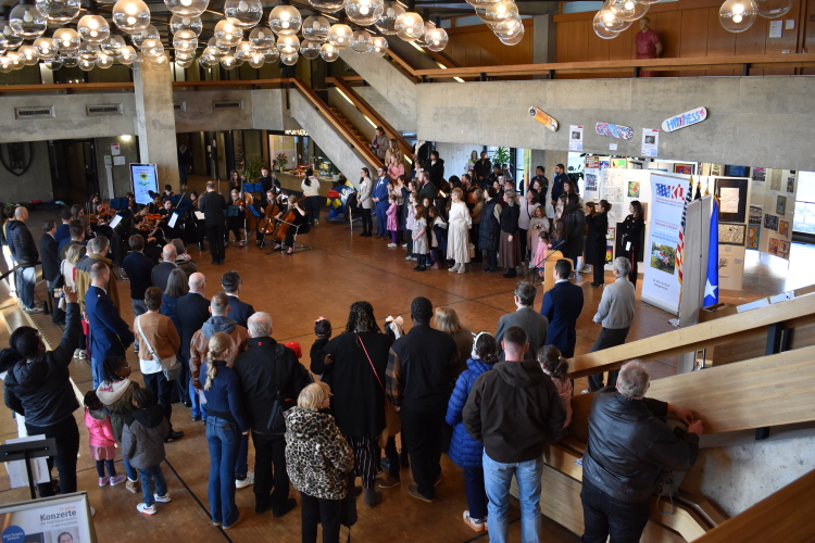 Am Dienstag, 18. Februar 2025, haben Oberbürgermeisterin Beate Kimmel als Schirmherrin und Generalmajor Paul D. Moga als Schirmherr des Deutsch-Amerikanischen Bürgerbüros (German-American Community Office – GACO) die diesjährige deutsch-amerikanische Schülerkunstausstellung im Foyer des Kaiserslauterer Rathauses eröffnet. Unter dem Motto „Kunst bringt uns zusammen“ zeigt die Ausstellung jeweils bis zu 20 Exponate der teilnehmenden deutschen und amerikanischen Schulen aus der Region. Musikalisch untermalt wurde die Veranstaltung vom Streicherensemble der Ramstein High School.