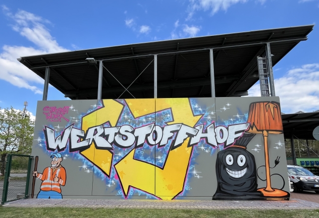 „Graffiti-Künstler*in gesucht – Unser Wertstoffhof braucht Farbe!“ – unter diesem Motto hatte die Stadtbildpflege Kaiserslautern (SK) Anfang März zum Mitmachen aufgerufen. Gesucht wurden kreative Köpfe, die Lust hatten, die große Außenwand am Wertstoffhof in der Daennerstraße künstlerisch zu gestalten – mit einem Motiv rund um die Themen Recycling, Umwelt und Stadtbildpflege. Der Aufruf richtete sich an etablierte Street-Art-Künstlerinnen und -Künstler ebenso wie an Nachwuchstalente. Bis zum 4. April konnten Entwürfe und Arbeitsproben eingereicht werden. Die Farben für die Umsetzung und die Verpflegung stellte die SK.