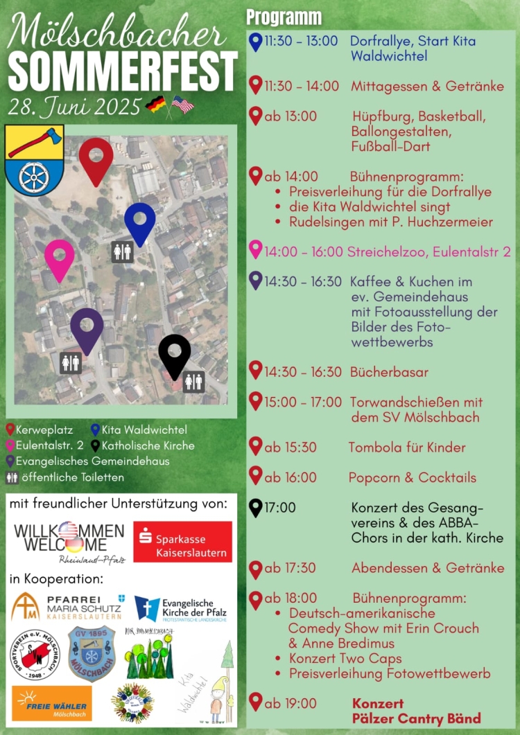 Das Mölschbacher Sommerfest wird vom Landesprogramm "Wilkommen in Rheinland-Pfalz! Unsere Nachbarn aus Amerika" sowie der Sparkasse Kaiserslautern unterstützt.