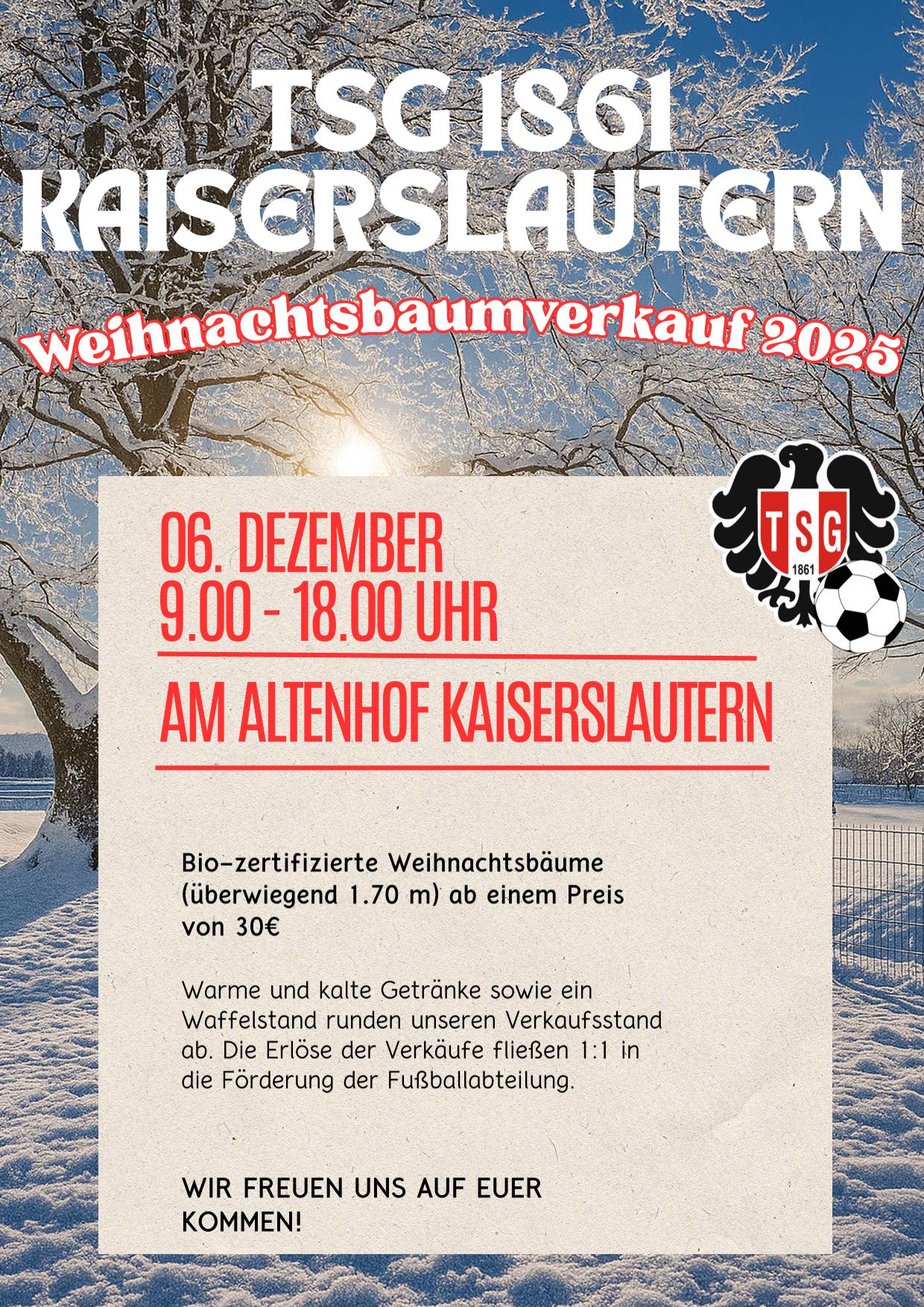 Am 06. Dezember wird der Altenhof wieder zum Ort der Begegnung und des Miteinander. In Kooperation mit dem TSG 1861 Kaiserslautern e.V. lädt das Citymanagement zum stimmungsvollen Weihnachtsbaumverkauf am Altenhof ein. Mit dem Kauf einer Tanne schenken Sie nicht nur Ihrem Zuhause festlichen Glanz- Sie unterstützen zugleich die wertvolle Vereinsarbeit des TSG.