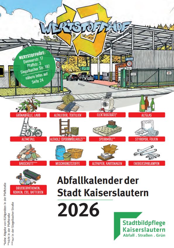Die Stadtbildpflege Kaiserslautern lässt zurzeit den städtische Abfallkalender 2026 als Hauswurfsendung im Stadtgebiet verteilen. In der praktischen DIN A5-Broschüre finden sich wieder viele wichtige und aktuelle Informationen rund um die richtige Abfallentsorgung in Kaiserslautern.