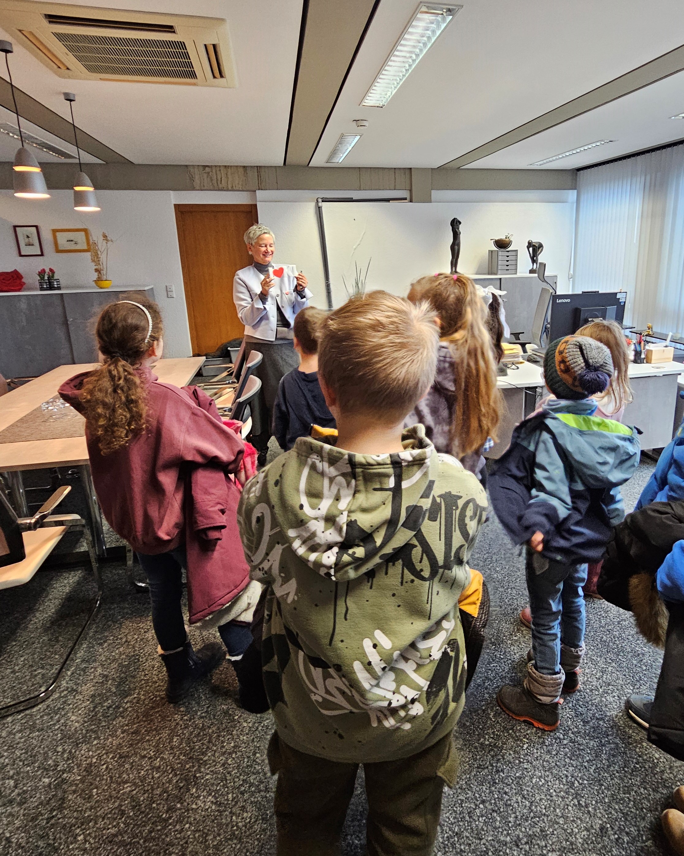 Noch bevor man sich im Kleinen Ratssaal versammelte, zeigte die Oberbürgermeisterin den Kindern und ihren Begleitern – Schulleiterin Anastasia Gelm und zwei Lehrkräften – ihr Dienstzimmer, wo sie allerlei Dinge erklären musste. Etwa warum ihre Uhr ein paar Minuten vorgeht oder was es mit dem „Handwerkszeug“ der Oberbürgermeisterin auf sich hat, das sie zu ihrem Amtsantritt vom Morlautrer Ortsvorsteher Alexander Lenz geschenkt bekommen hatte.
