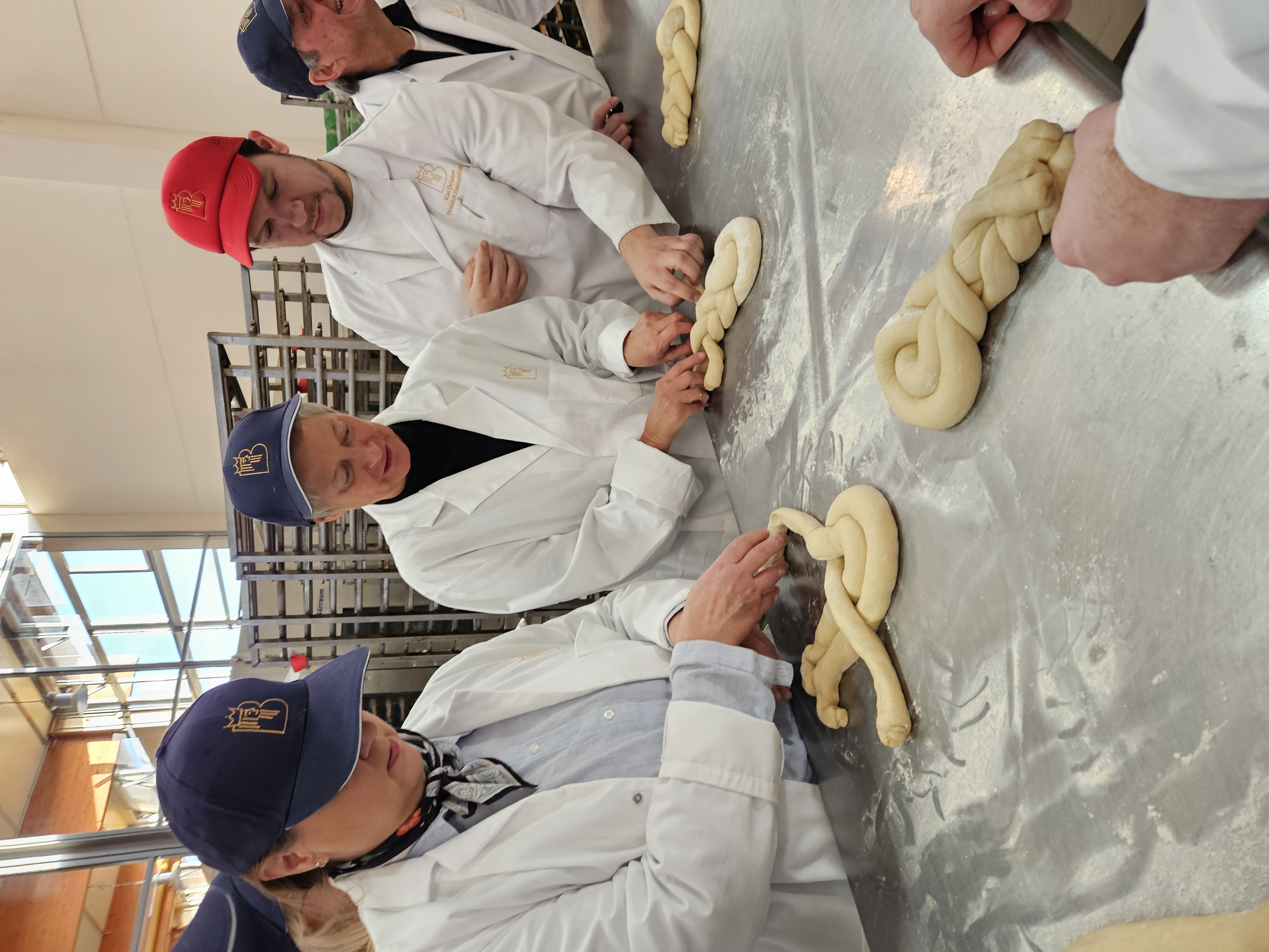Angeleitet von Produktionsleiter Kai Drumm durfte sich die Gruppe um OB Kimmel (links Veronika Pommer, Regionalleiterin IHK) auch am Flechten eines Hefezopfes versuchen. © Stadt Kaiserslautern