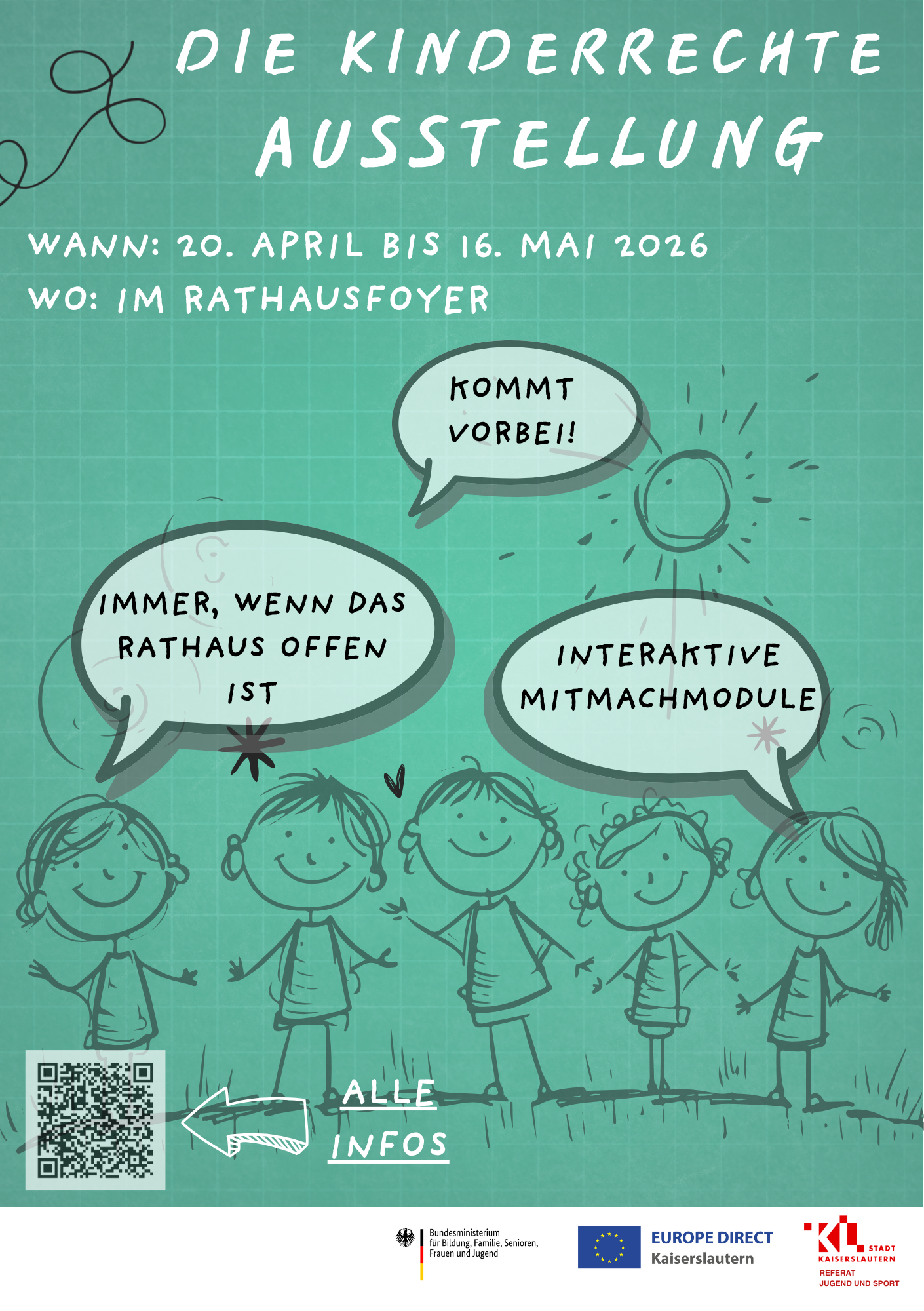 Die Ausstellung wird vom Referat Jugend und Sport in Zusammenarbeit mit EUROPE DIRECT Kaiserslautern organisiert. Leihgeber der Ausstellung ist das Bundesministerium für Bildung, Familie, Senioren, Frauen und Jugend (BMBFSFJ). Weitere Informationen zur Ausstellung gibt es auf der zugehörigen Seite des BMBFSFJ unter www.bmbfsfj.bund.de/bmbfsfj/themen/kinder-und-jugend/kinderrechte/kinderrechte-im-alltag/die-kinderrechte-ausstellung-240082.