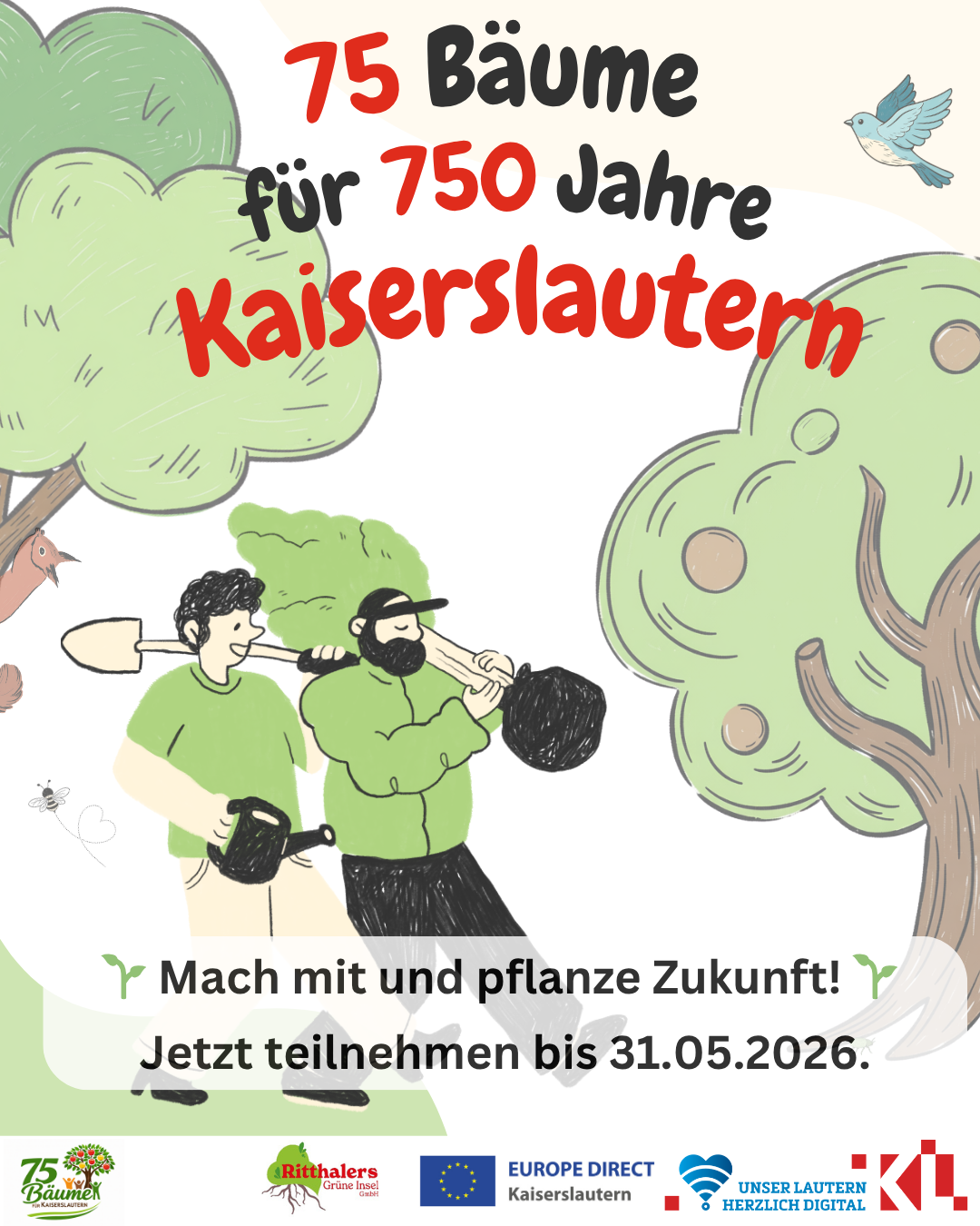 Zum Tag des Baumes am 25. April beginnt in Kaiserslautern die Aktion „75 Bäume für 750 Jahre Kaiserslautern“. Gemeinsam setzen das EUROPE DIRECT Kaiserslautern, die KL.digital GmbH i. L. und das Referat Umweltschutz der Stadt zum Stadtjubiläum ein sichtbares Zeichen für Klimaschutz, Biodiversität und bürgerschaftliches Engagement.