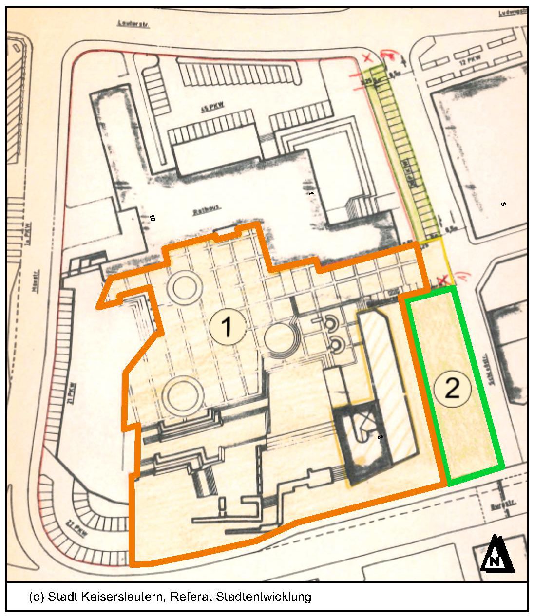 Rathausvorplatz und den ehemaligen öffentlichen Parkplatz westlich der Straße Willy-Brandt-Platz, beides Teilstücke aus Gemarkung Kaiserslautern, Flurstücks Nr. 403/7 –Nr. 1 und 2 der nachfolgenden Planskizze