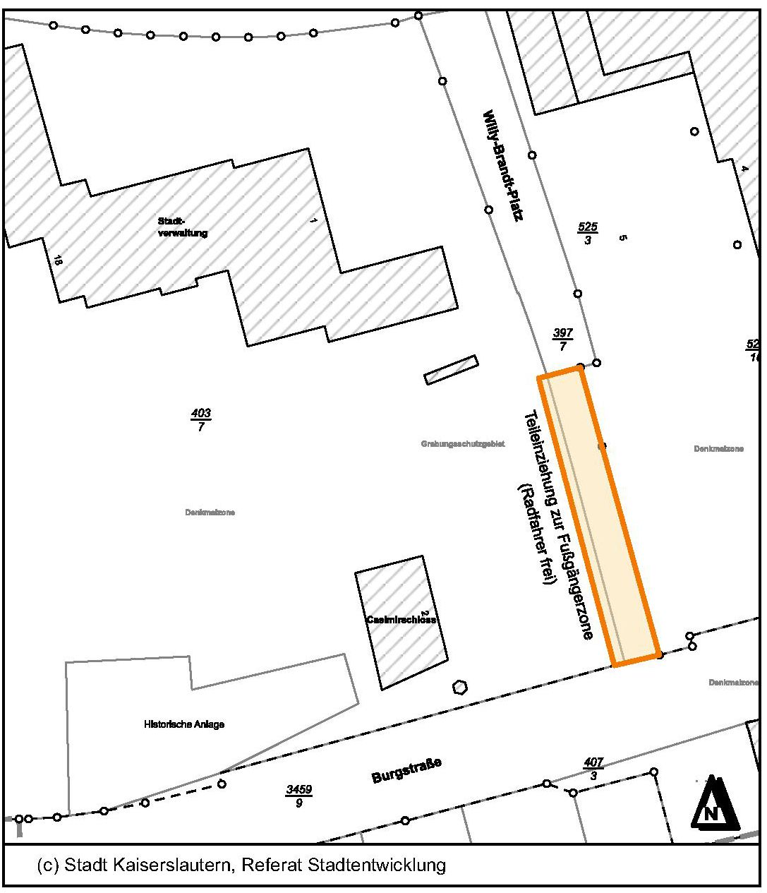 Südliches Teilstück der Straße Willy-Brandt-Platz (zwischen Burgstraße und ehem. Zufahrt zum Parkplatz), Teilstück aus Gemarkung Kaiserslautern, Flurstücks Nr. 397/7 und 403/7 gemäß der nachfolgenden Planskizze