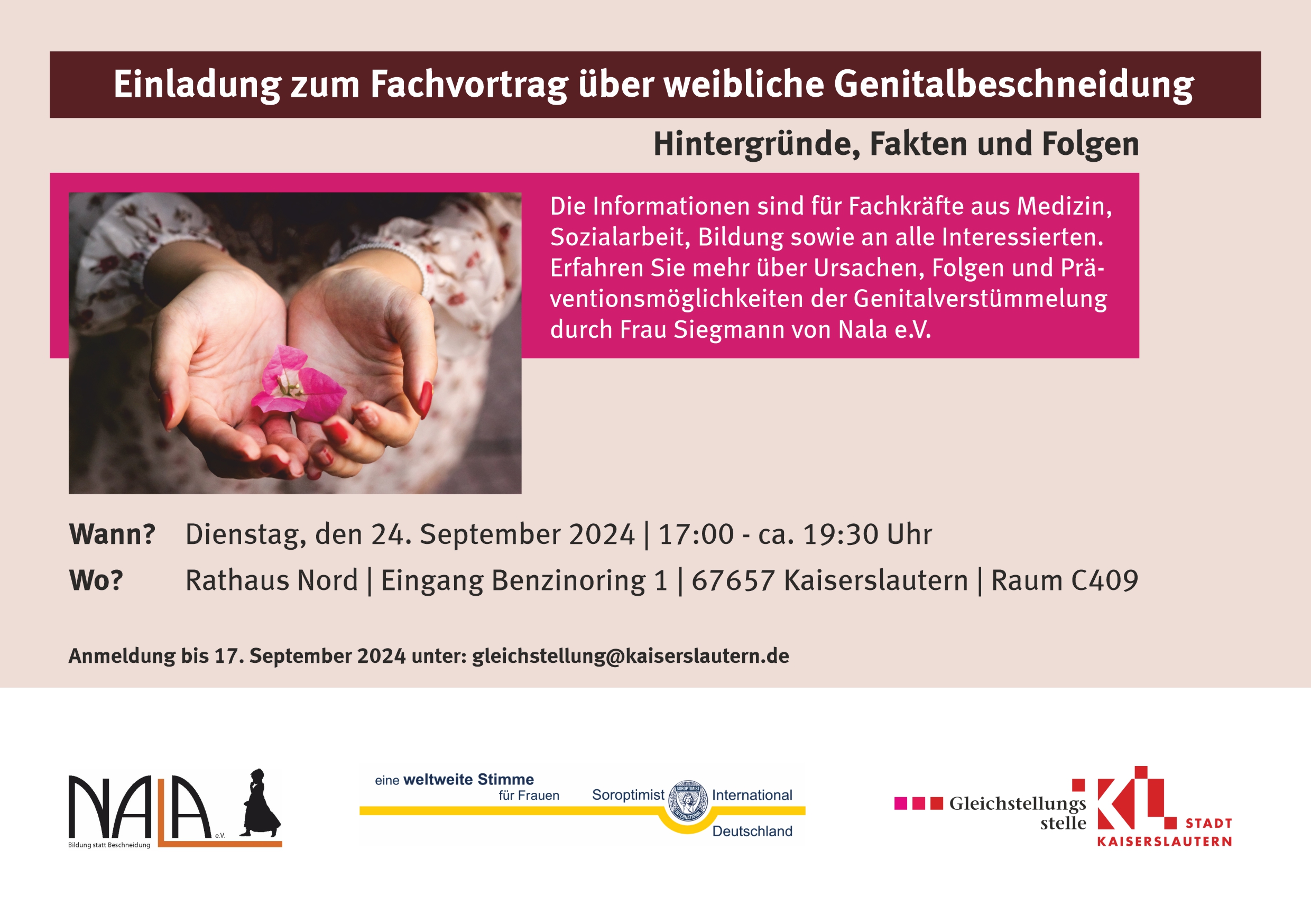 Wir bitten um vorherige Anmeldung per E-Mail an gleichstellung@kaiserslautern.de bis zum 17.09.2024