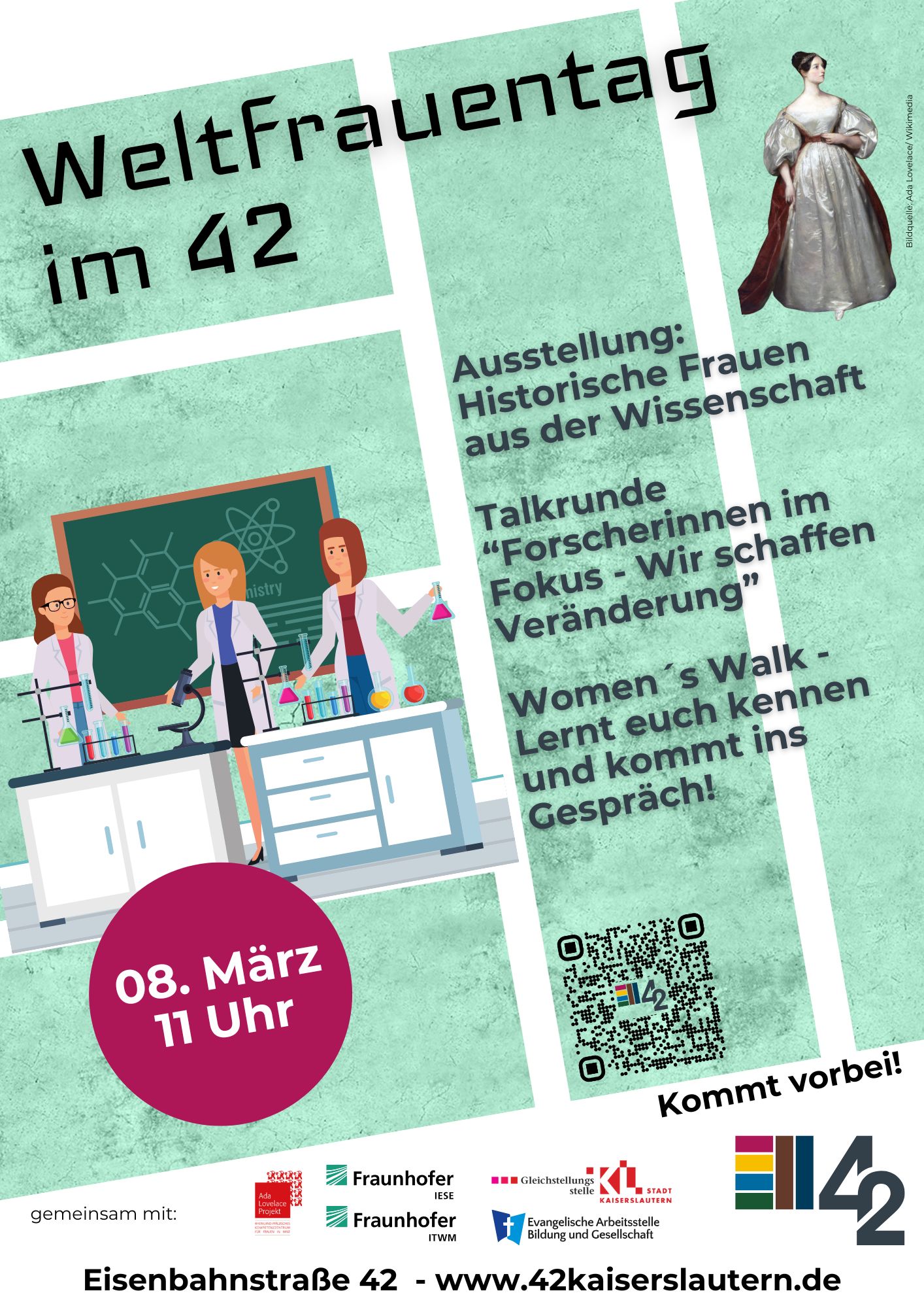 Zum Internationalen Weltfrauentag am 8. März laden wir gemeinsam mit dem 42Kaiserslautern, dem Ada-Lovelace-Projekt, den Fraunhofer- Instituten aus Kaiserslautern und der Evangelischen Arbeitsstelle Bildung und Gesellschaft zu einem vielfältigen Programm ein, mit dem wir die Bedeutung von Frauen in Wissenschaft, Forschung und Politik würdigen.