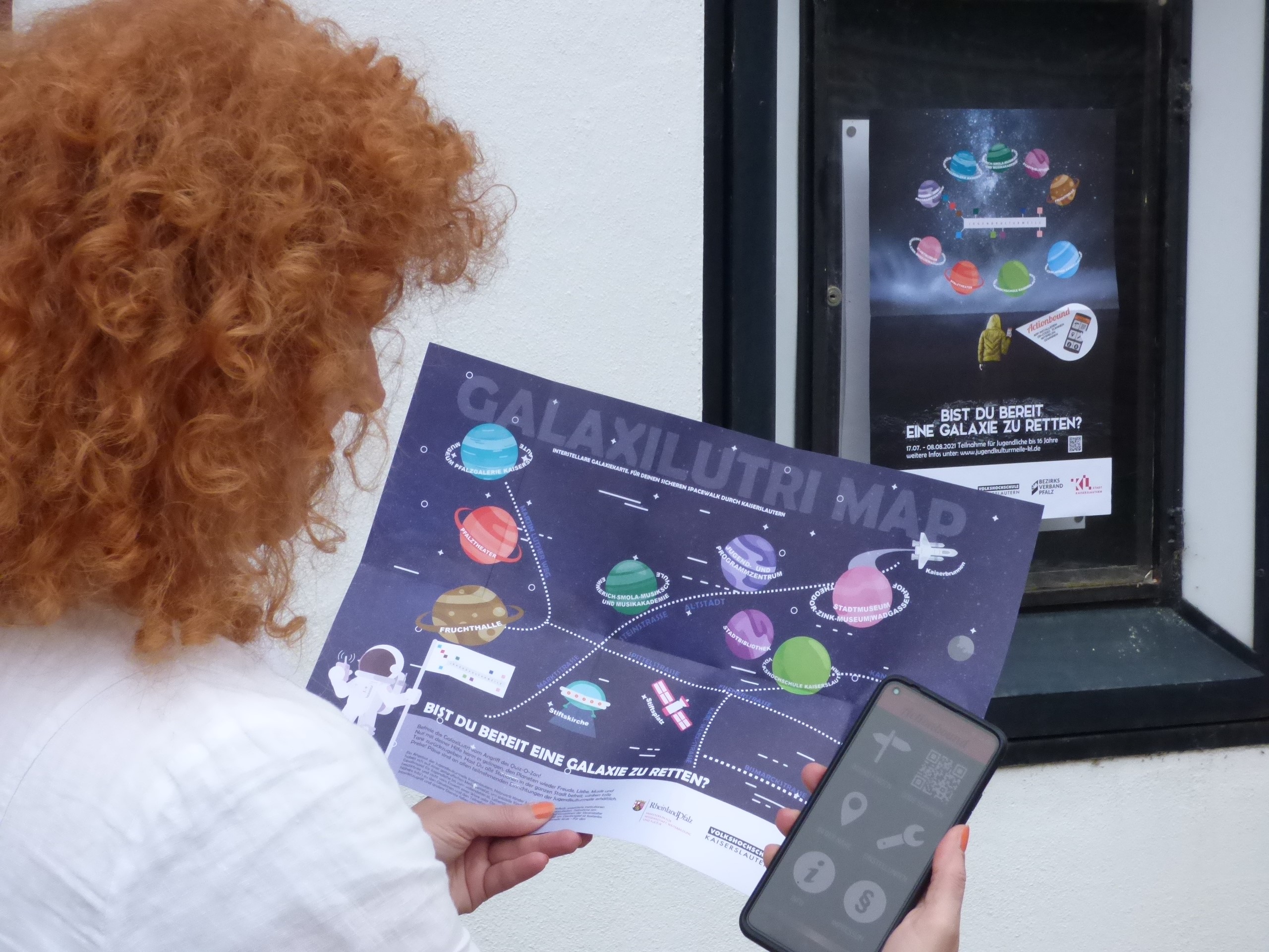 Ein Smartphone mit der Actionbound-App, dazu der Pass der Jugendkulturmeile… das ist die Ausrüstung, die die jugendlichen Spielerinnen und Spieler benötigen, um in ein aufregendes Abenteuer zu starten. Es führt sie auf einer spannenden Reise quer durch die GalaxiLutri, die von einem gemeinen Quiz-O-Zon angegriffen wurde und nun dringend Hilfe benötigt.