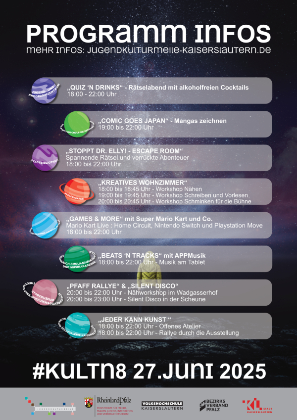 - unter diesem Motto Lädt die Jugendkulturmeile alle Jugendlichen von 12-18 Jahren ein, die vielseitigen Angebote in den verschiedenen Lokations zu entdecken. Seid dabei und musiziert, zeichnet, tanzt, näht, seid kreativ, entdeckt.... es ist für jeden Geschmack etwas dabei!