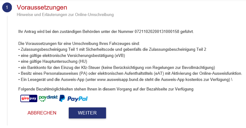 Bitte vergewissern Sie sich, dass Sie das Portal der für Sie zuständigen Zulassungsbehörde geöffnet haben. Ausschlaggebend ist der auf dem Personalausweis gespeicherte Wohnort.
