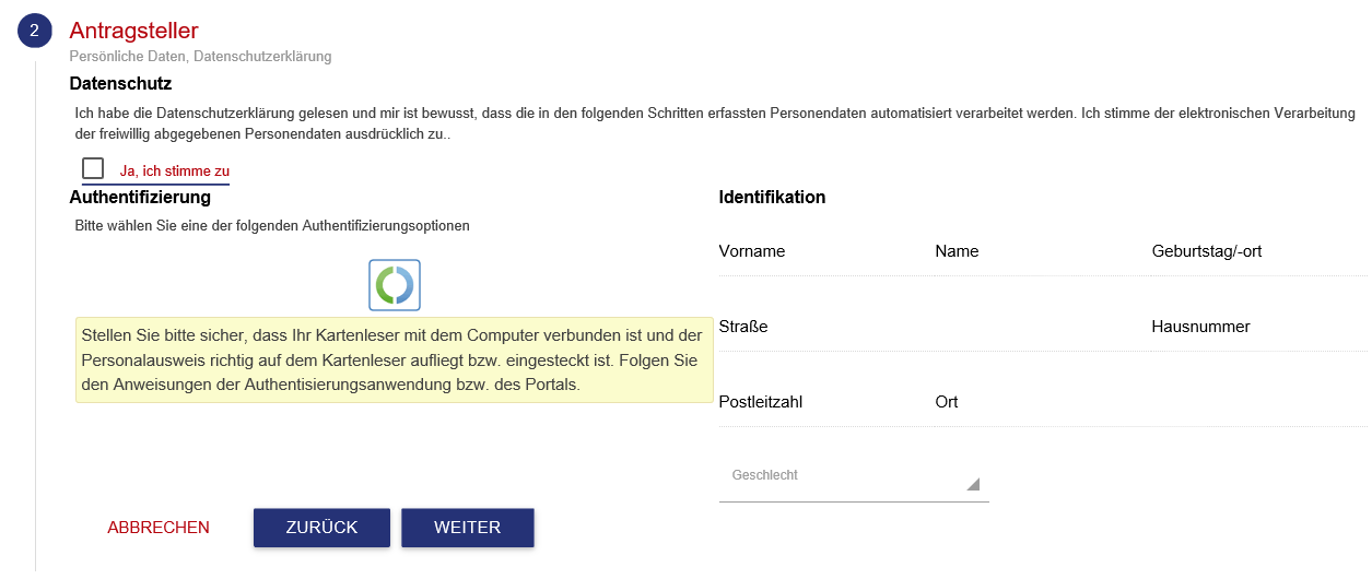 Mit „Weiter“ starten Sie das Einlesen der Antragssteller- bzw. Ihrer Personendaten.