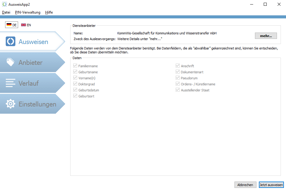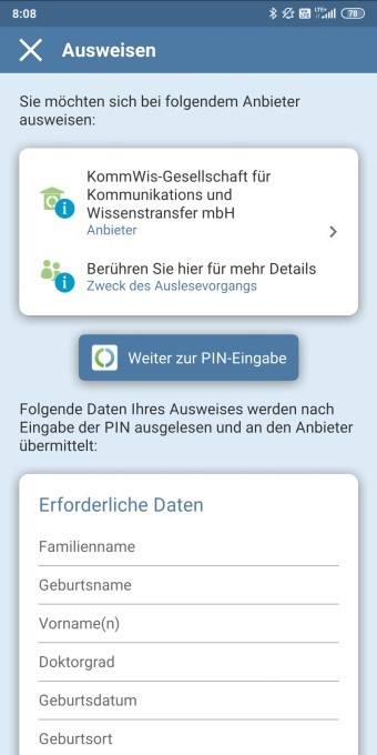 Hier sehen Sie, wer welche Daten abfragt. Die KommWis-Gesellschaft für Kommunikation und Wissenstransfer mbH, wie hier zu sehen, ist der Betreiber des Online-Portals und vertraglich mit der Stadtverwaltung Trier verknüpft. Klicken Sie auf Jetzt ausweisen (oder Weiter zur PIN-Eingabe) und geben Sie Ihren PIN des Personalausweises ein.