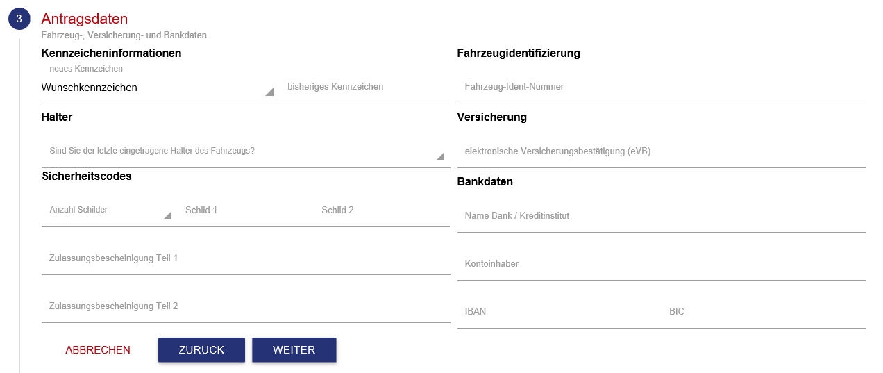 Bildbeschreibung: Eingabe der fahrzeugbezogenen Daten sowie der Versicherungs- und Kfz-Steuer relevanten Daten
