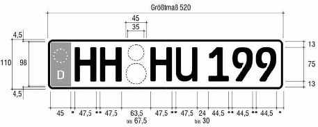 | Unterscheidungszeichen des Zulassungsbezirks | Erkennungsnummer des Fahrzeuges Buchstaben / Zahlen | |