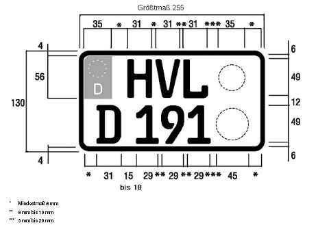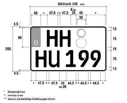 Bei der Zulassung von Fahrzeugen stellt sich oft die Frage, ob nicht ein kleineres Kennzeichen zugeteilt werden kann. Das genaue Aussehen der Kennzeichen, also Muster und Maße, ist in der Anlage 4 zu § 10 FZV (Fahrzeug-Zulassungsverordnung) verbindlich festgelegt.