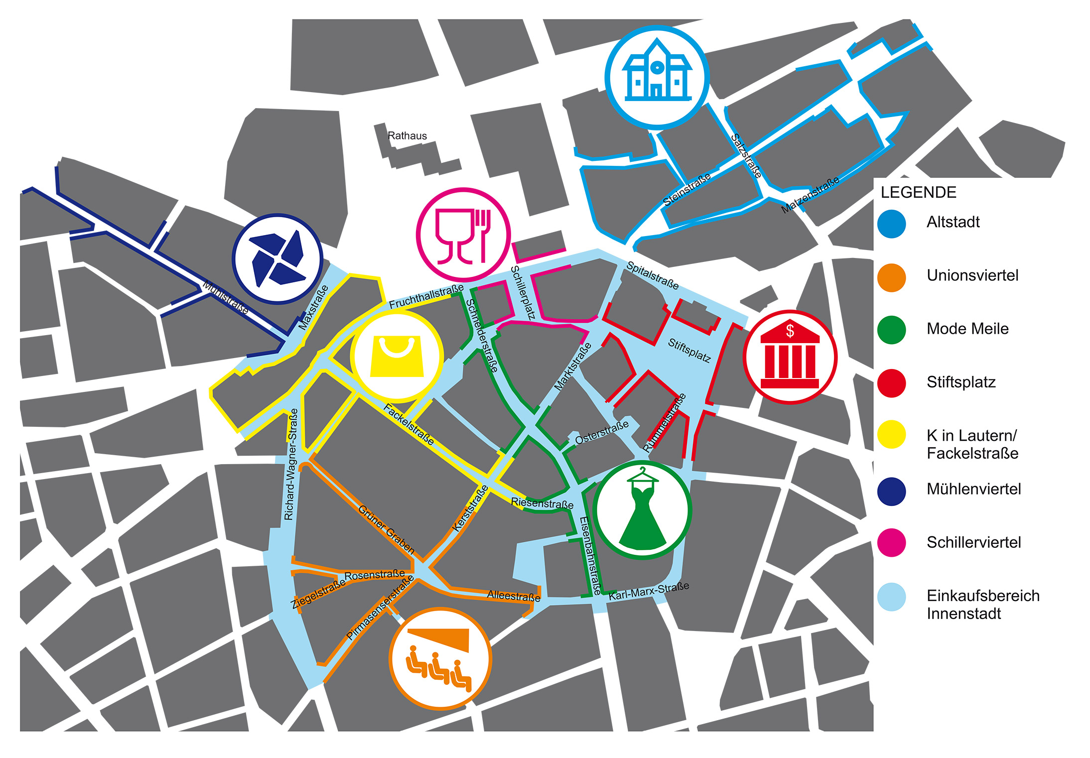 Das alles ist in den Quartieren und Straßen der Innenstadt zu finden. Unionsviertel, Modemeile, Stiftsplatz, Schillerviertel, Altstadt, Mühlstraße, und Fackelstraße/K in Lautern.