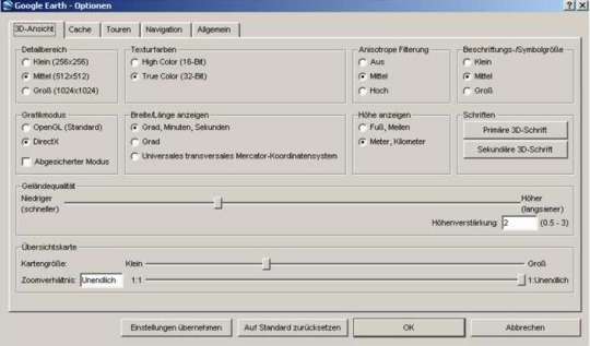 Zur korrekten Darstellung der 3D-Inhalte von Kaiserslautern, sollten Sie die nachfolgend Einstellungen in Google Earth vornehmen: Sie finden dieses Fenster in Ihrer Google Earth Menü-Leiste unter "Tools / Optionen".
