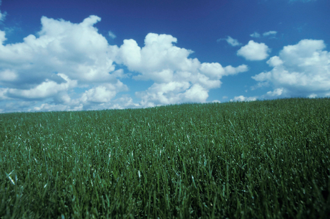 Grüne Wiese vor einem wolkig - blauen himmel