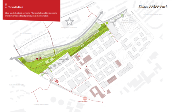 Am nordwestlichen Rand des Plangebiets wird, entsprechend des Gestaltungshandbuchs zu dem Pfaff-Gelände, die Erstellung eines Freiflächengestaltungsplans zur Schaffung einer öffentlichen Parkanlage angestrebt.