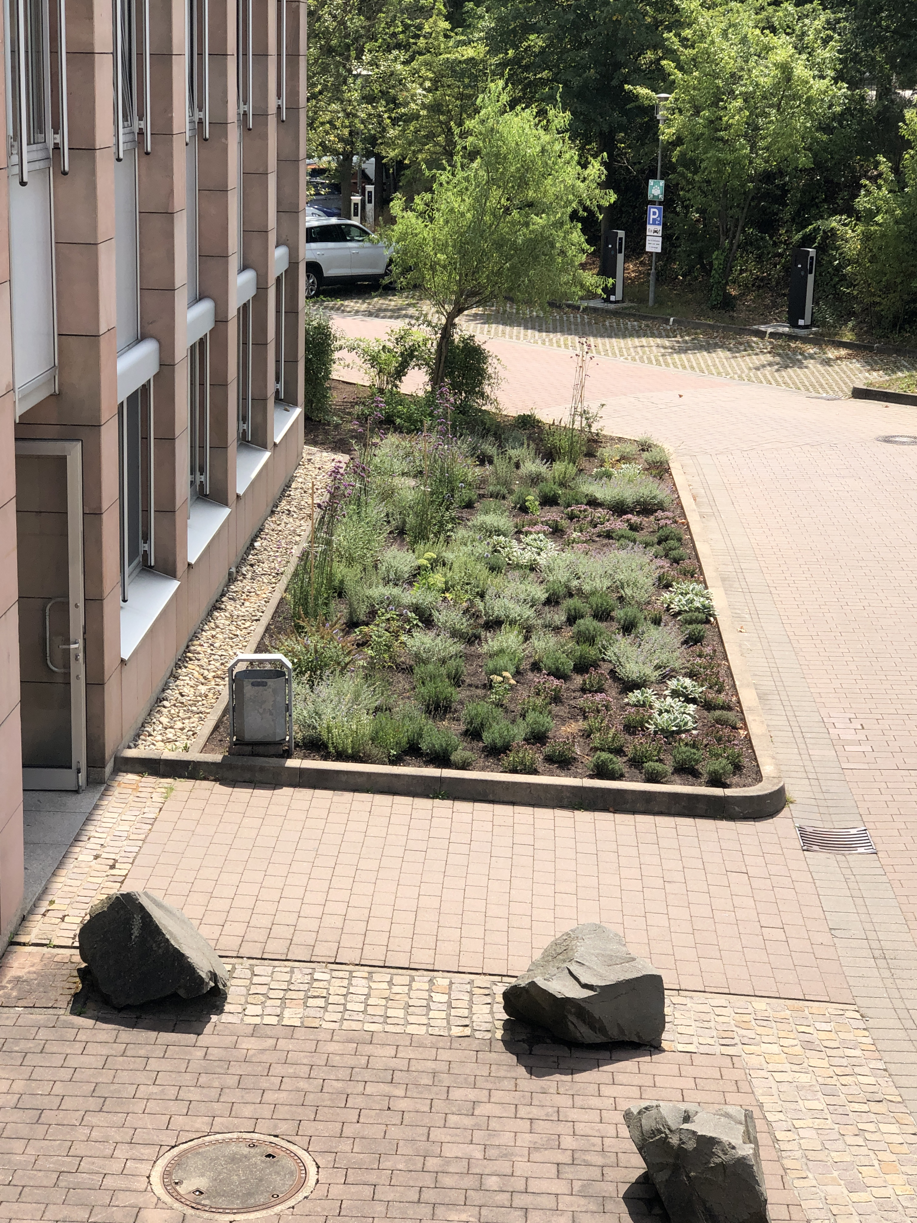 Der ehemalige Gastro-Außensitz auf dem jetzigen Gelände der Stadtentwässerung Kaiserslautern (Fläche ca. 60 m²) wurde im Rahmen von Umbaumaßnahmen entsiegelt. Durch Wahl von klimaresistenten und insektenfreundlichen Pflanzen wird zudem die Biodiversität (Maßnahme HG-06) gefördert.