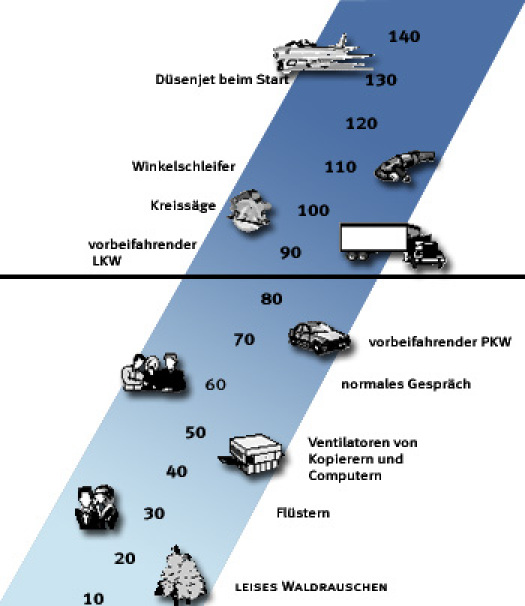 Die physikalische messbare Belastung durch den Schall wird in Dezibel (dB (A) ) angegeben. Der leiseste noch hörbare Ton liegt bei 0 dB (A), die Schmerzgrenze bei ca. 120 dB (A). Wird es lauter als 120 dB (A), besteht Verletzungsgefahr.