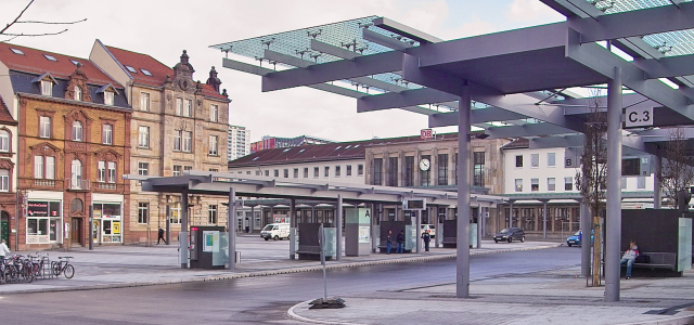 Busbahnhof mit Bahnhof im Hintergrund